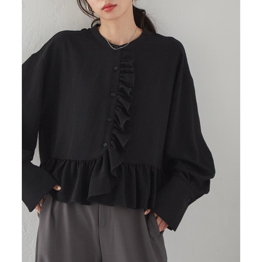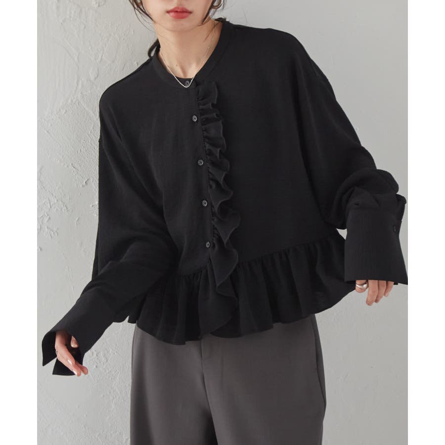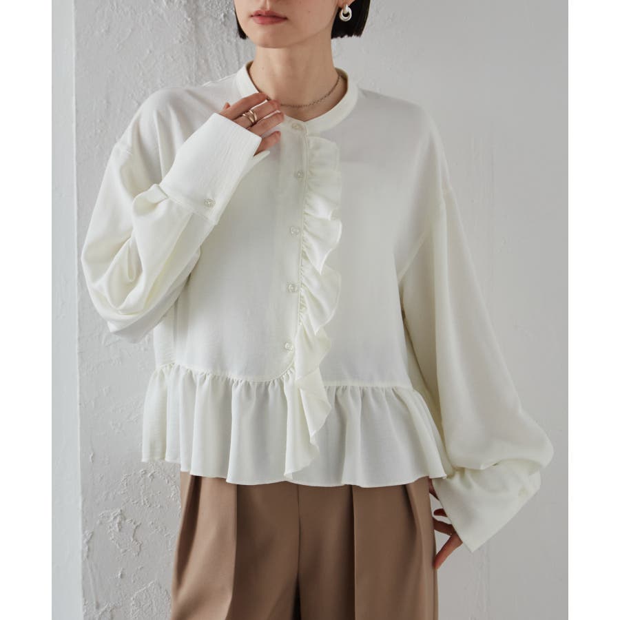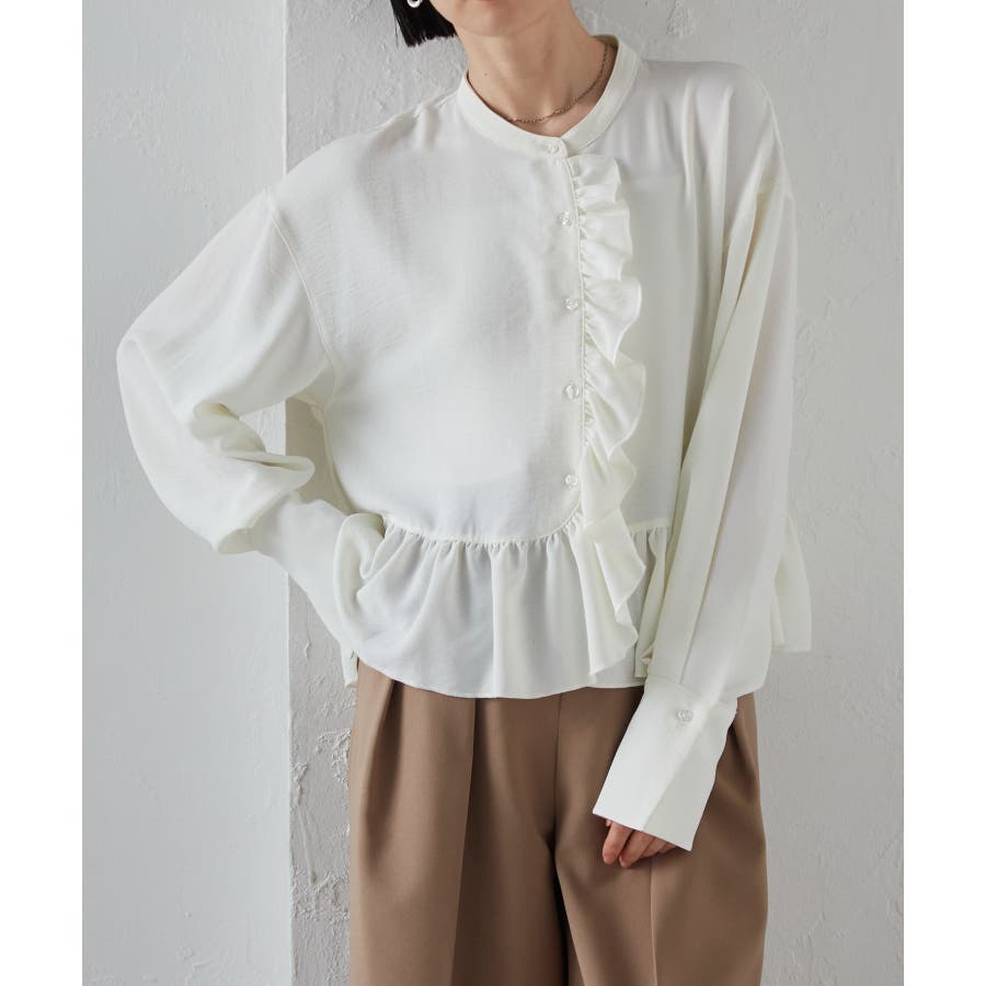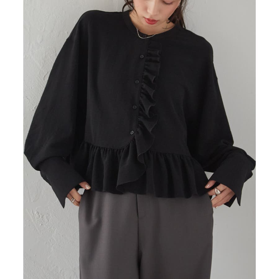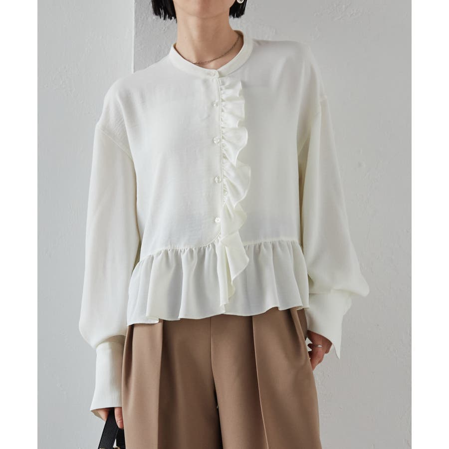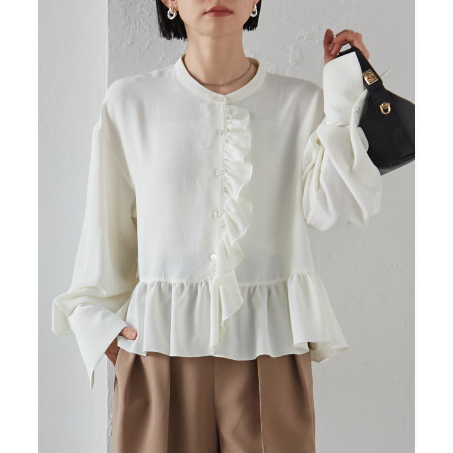 ゆったりとしたボリューム袖とフロントのフリルが魅力的なブラウス。