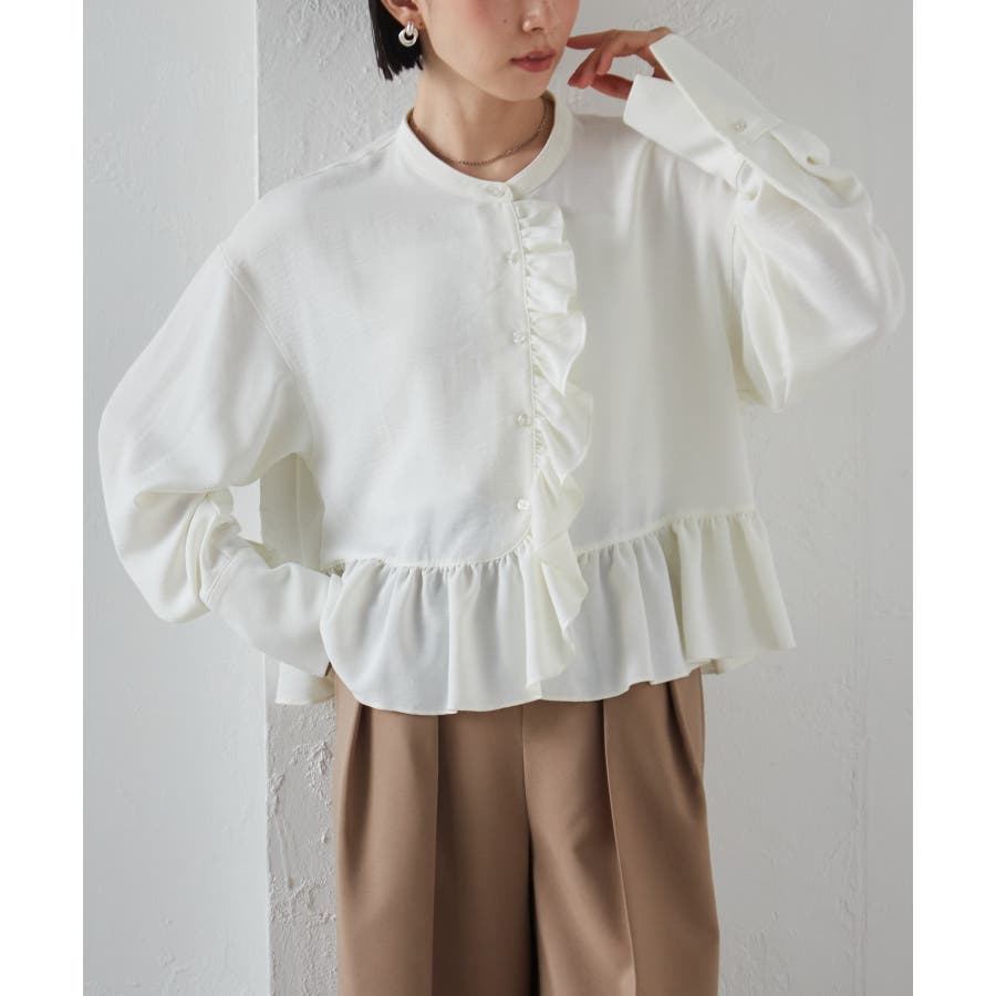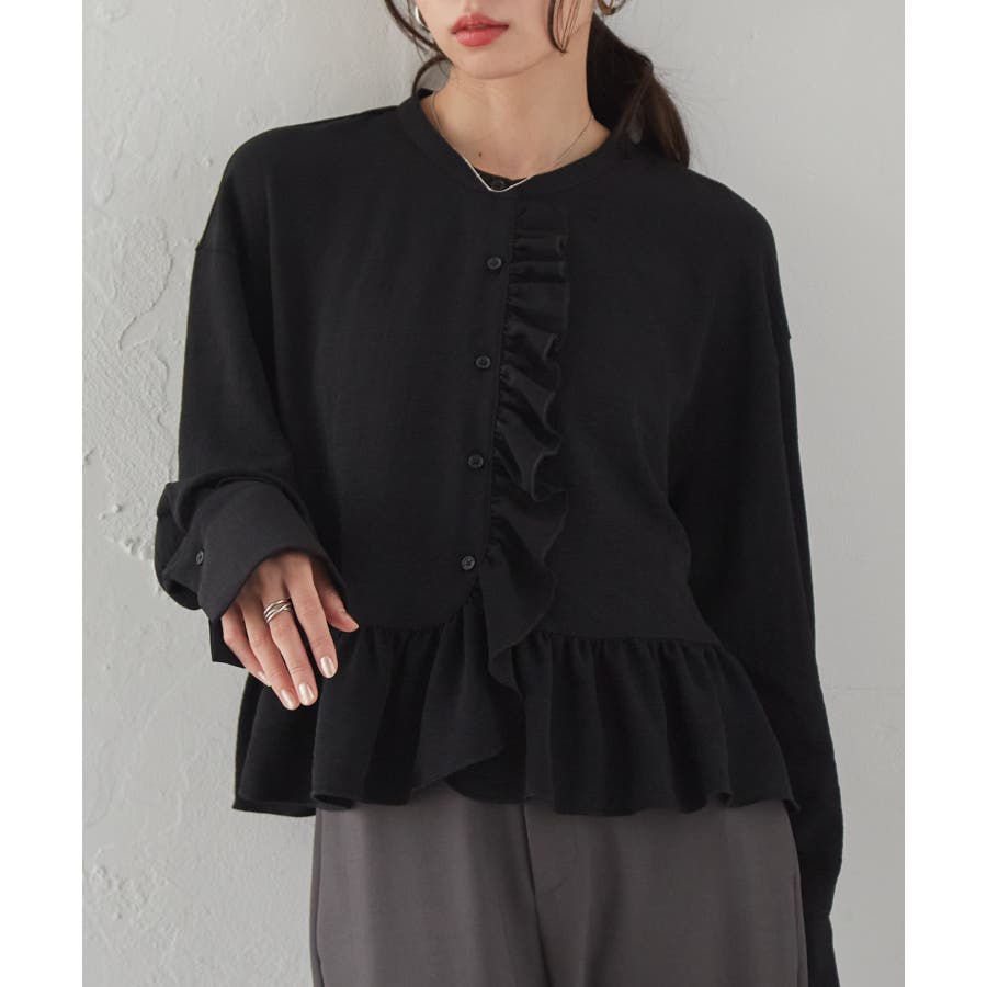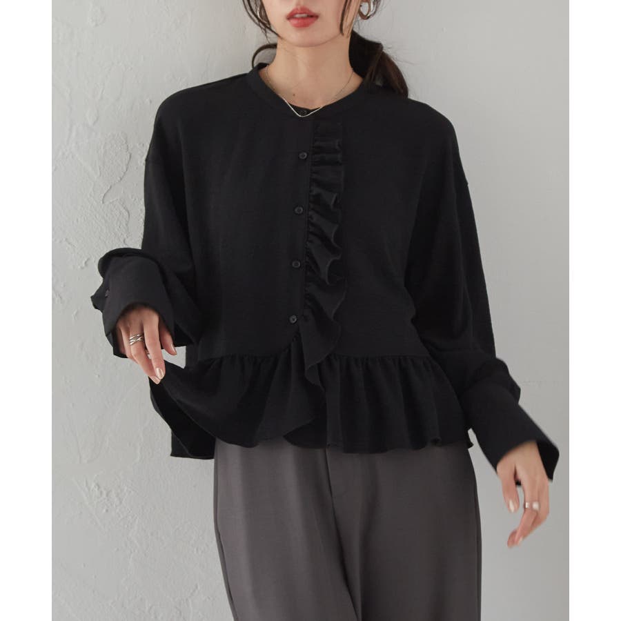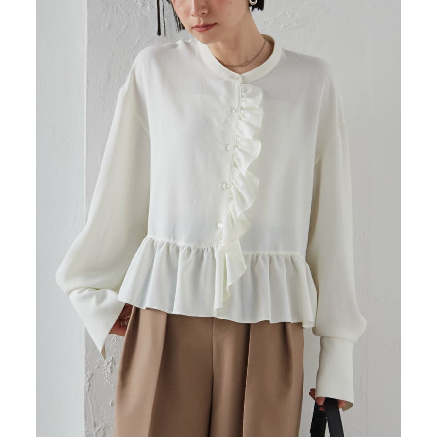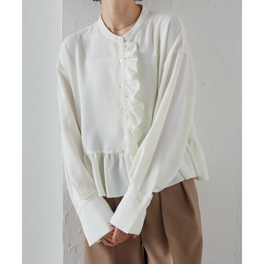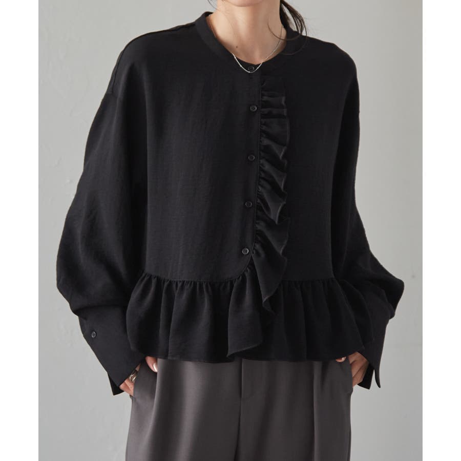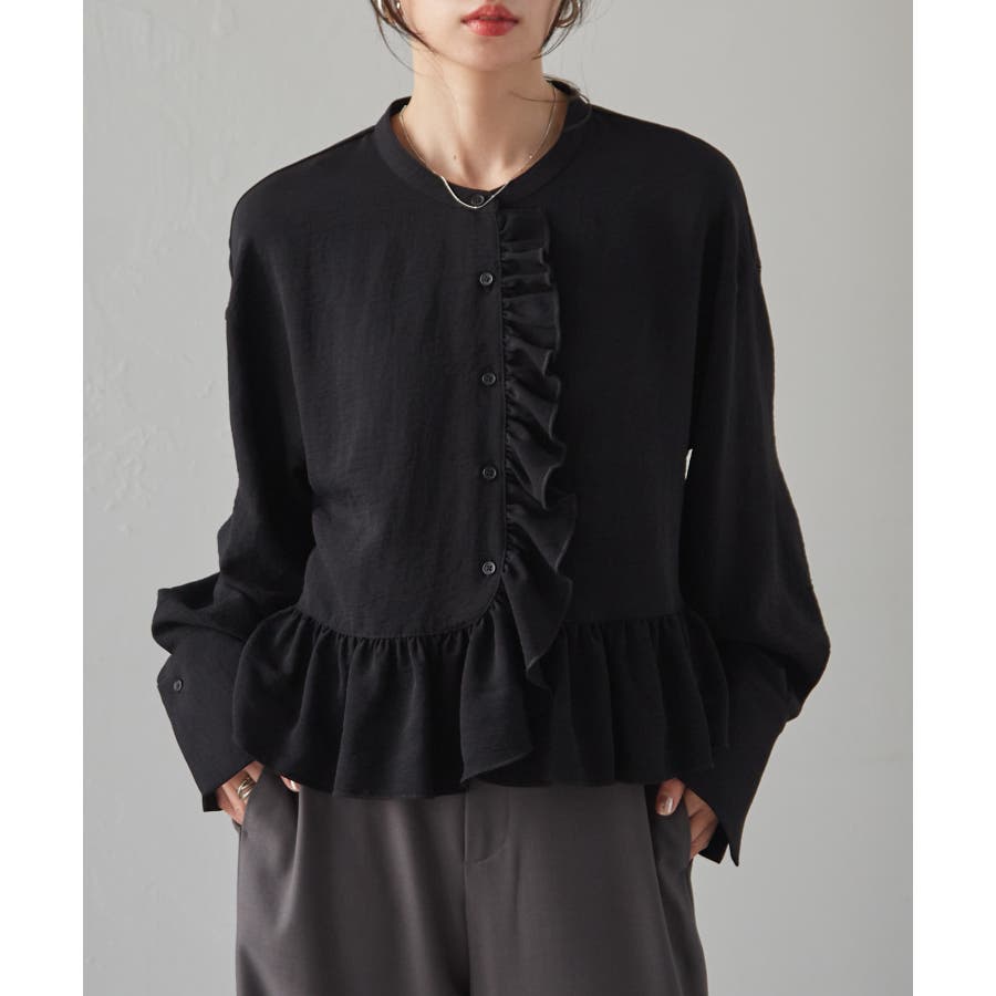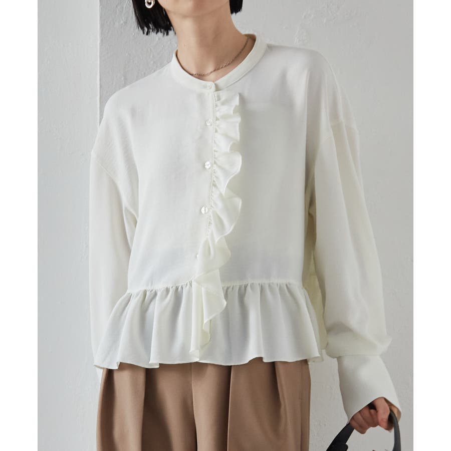ゆったりとしたボリューム袖とフロントのフリルが魅力的なブラウス。