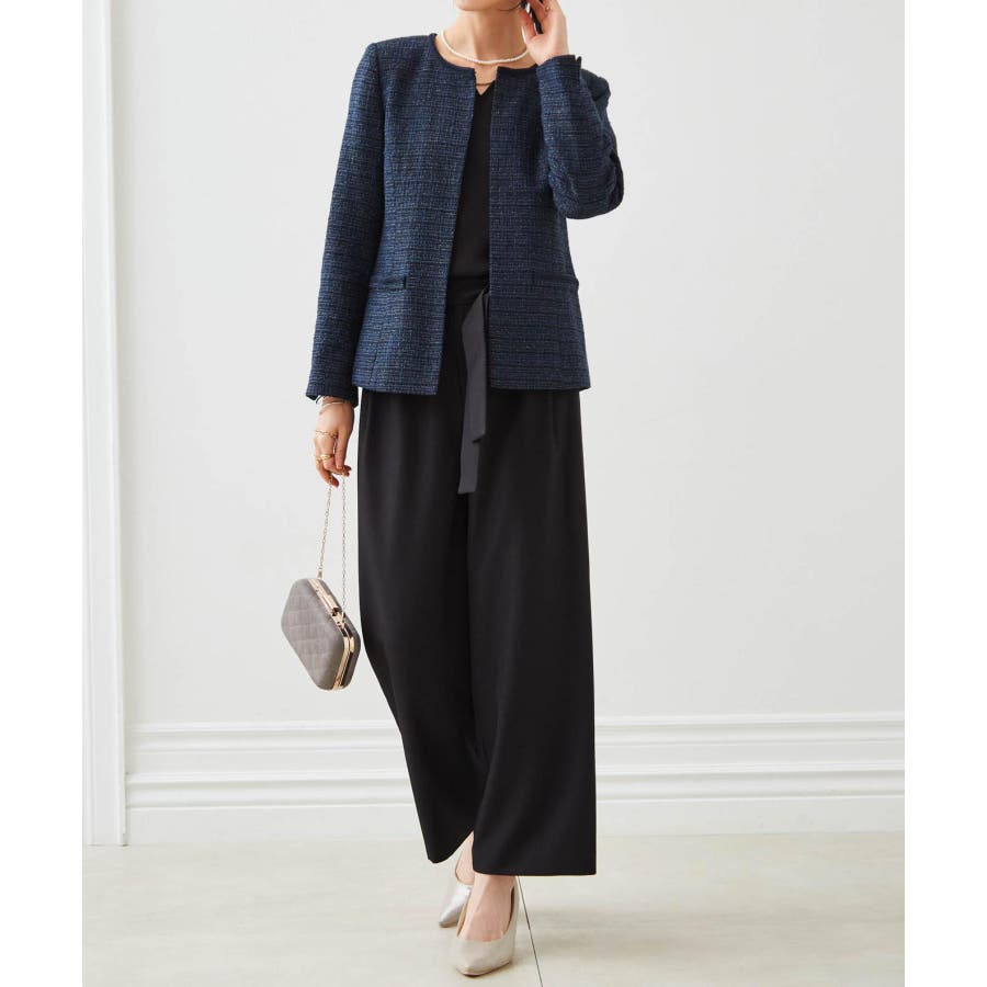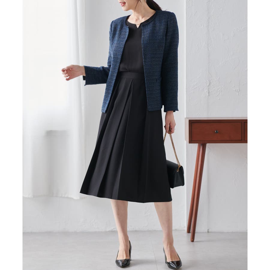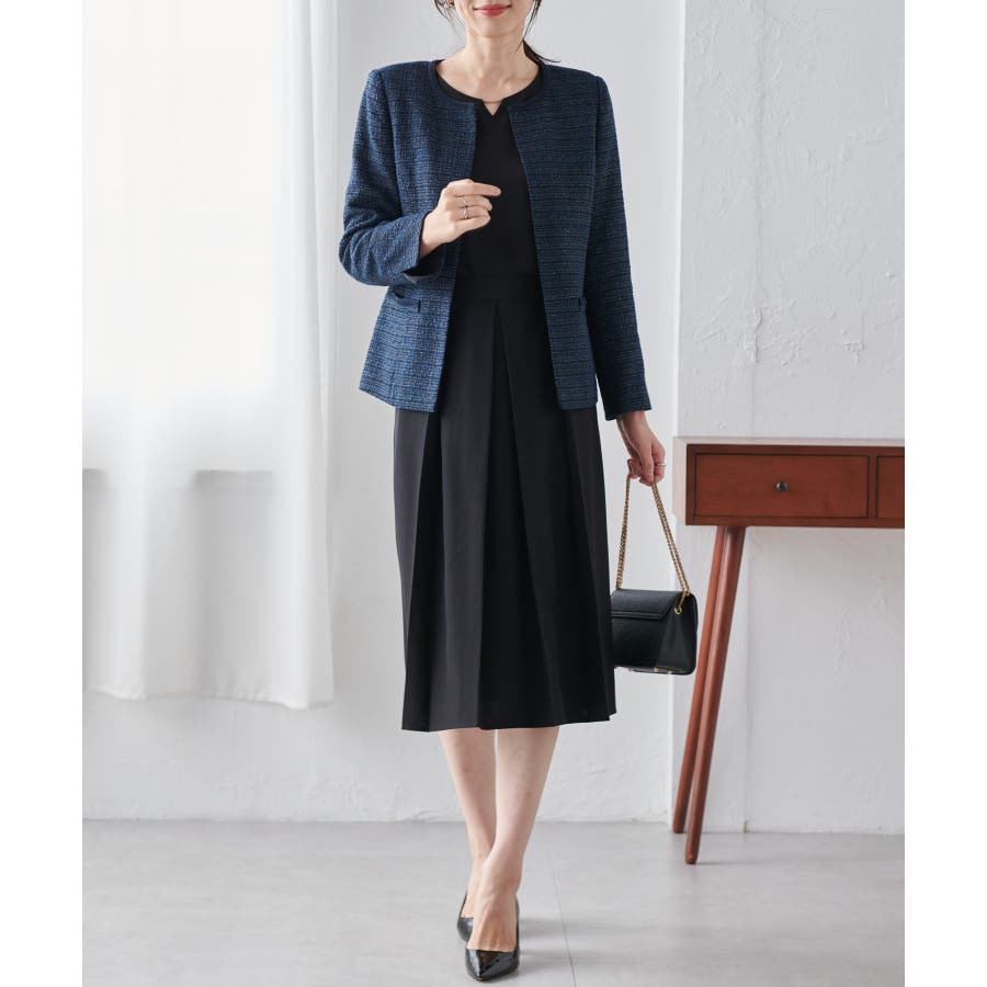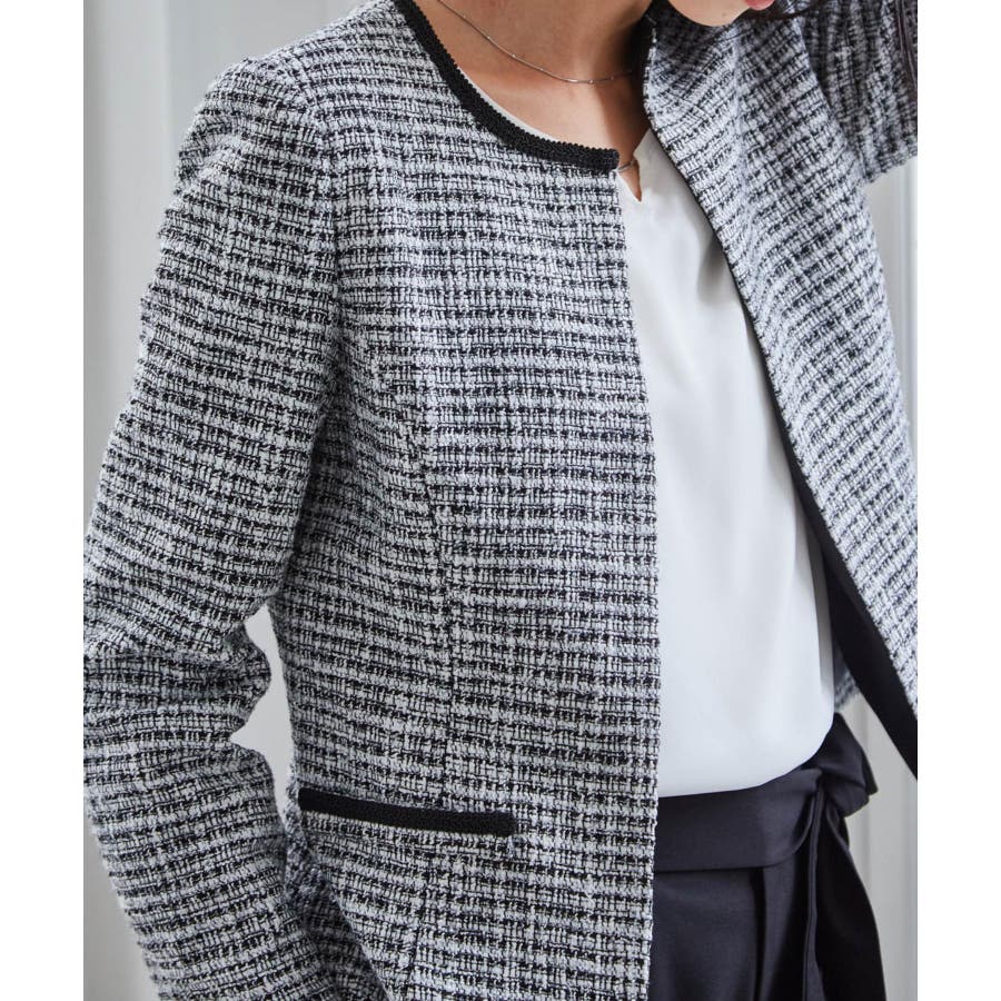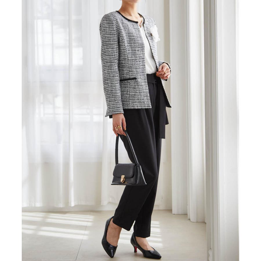 高見えツイードジャケットと華やかな金具付ブラウスがセットになった4点スーツ。