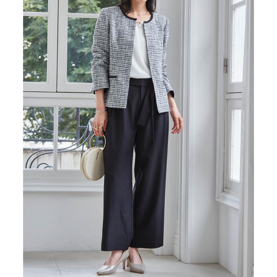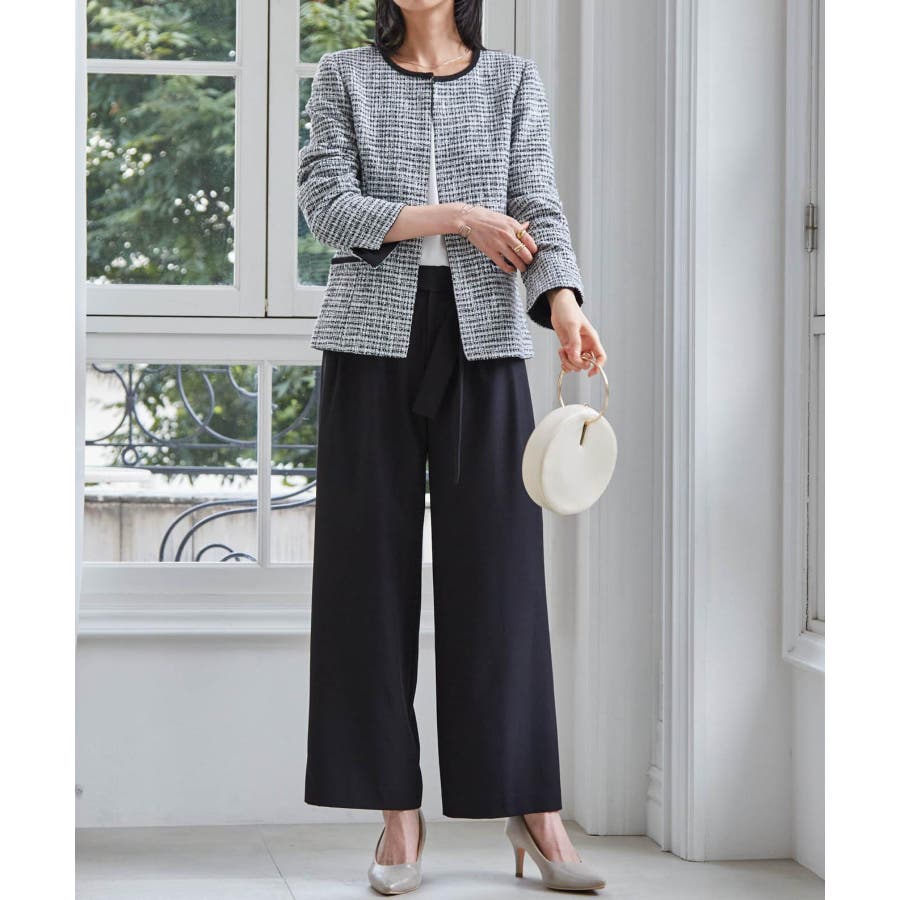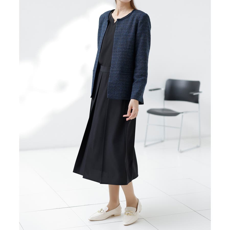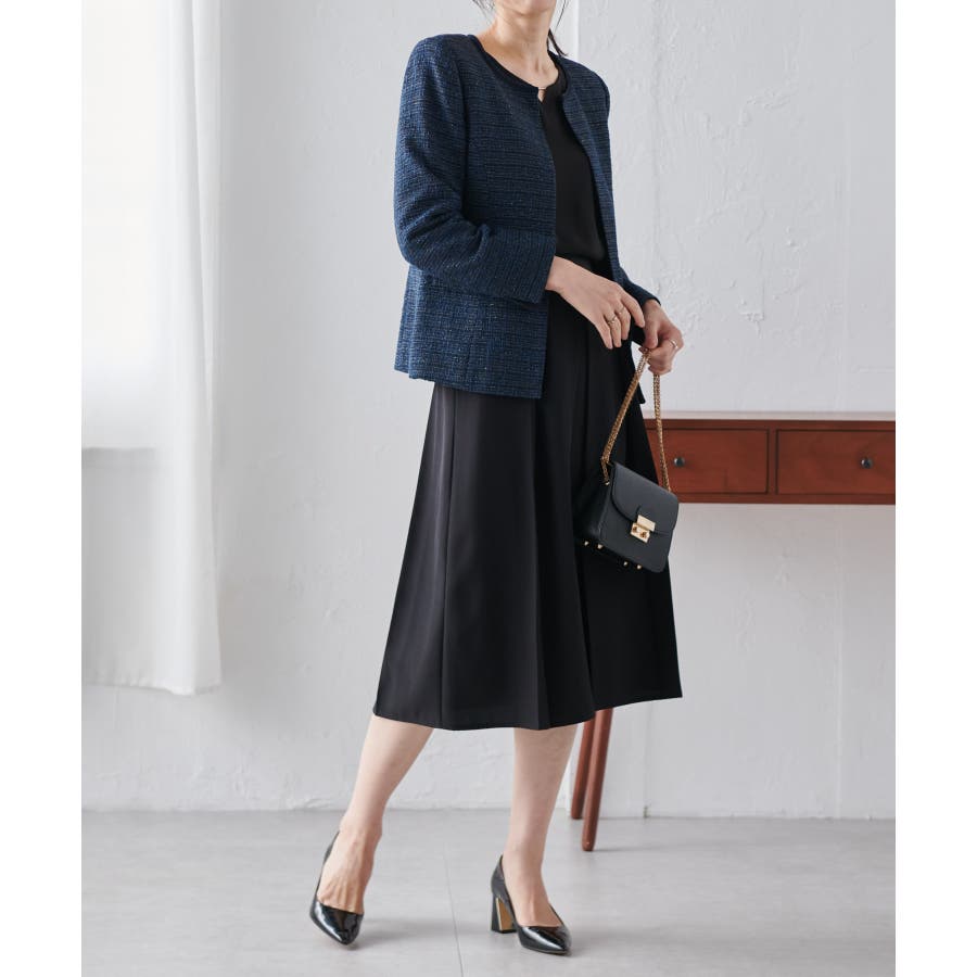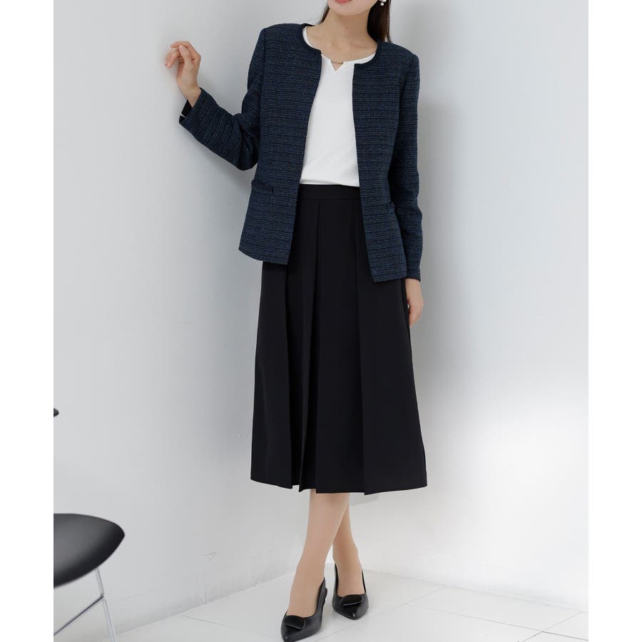 高見えツイードジャケットと華やかな金具付ブラウスがセットになった4点スーツ。