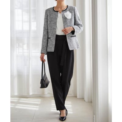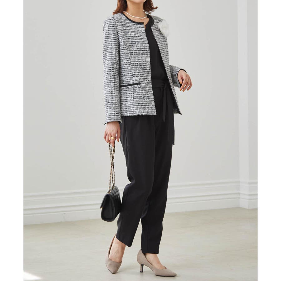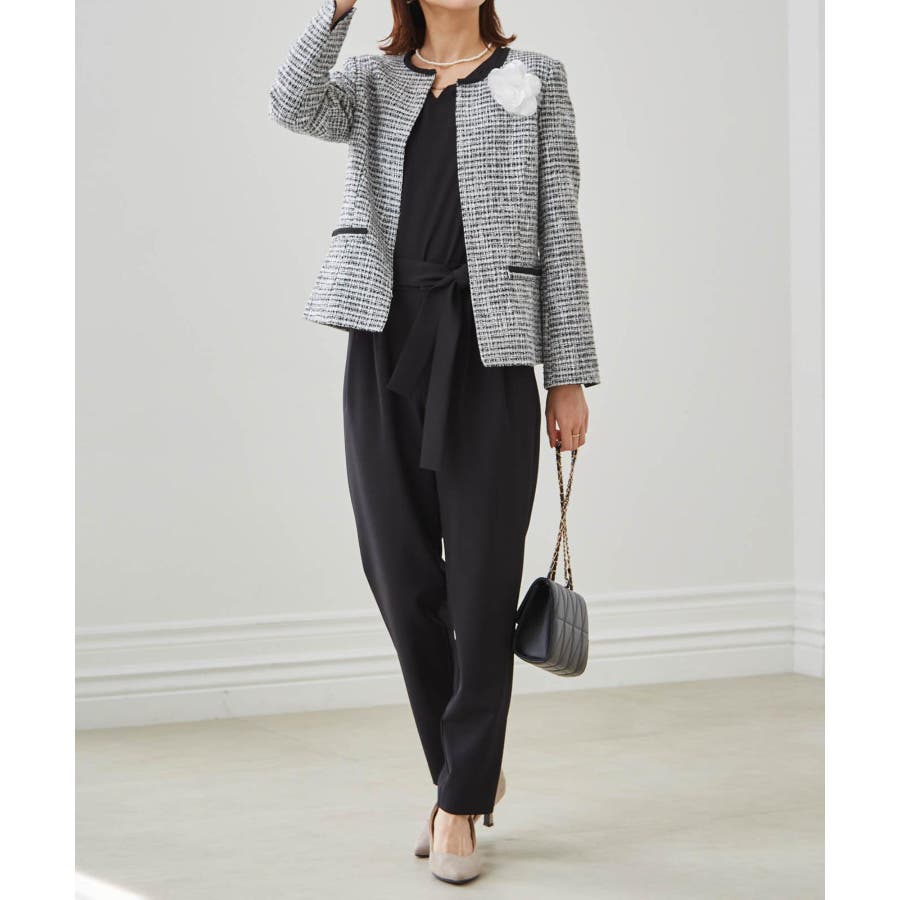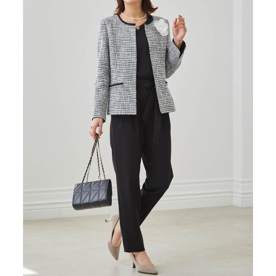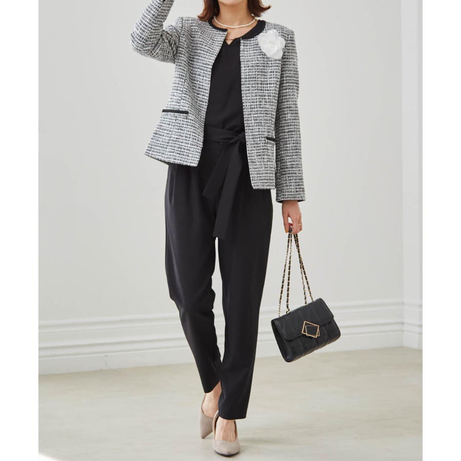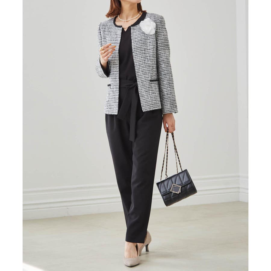 ブラック系1:モノトーン系ジャケット+ブラックブラウス+テーパードパンツ+コサージュ