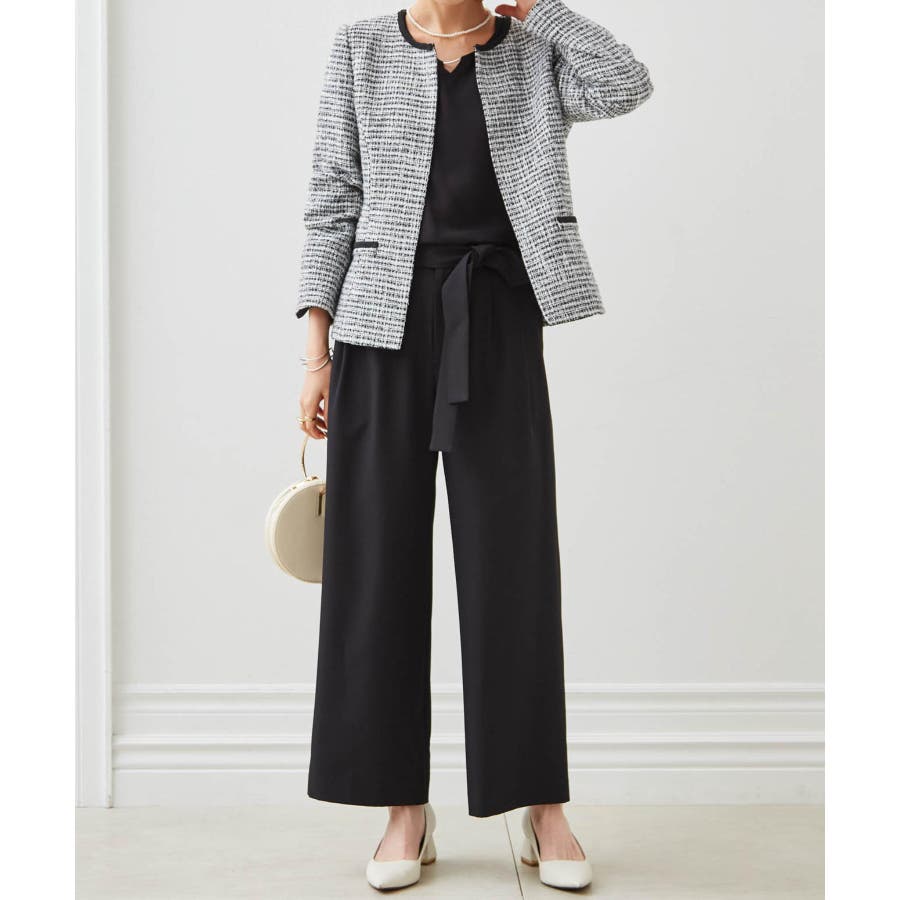 ホワイト系2:モノトーン系ジャケット+ホワイトブラウス+ワイドパンツ+コサージュ