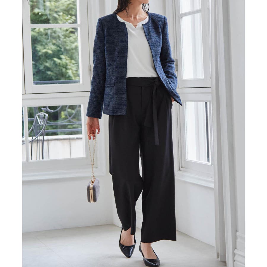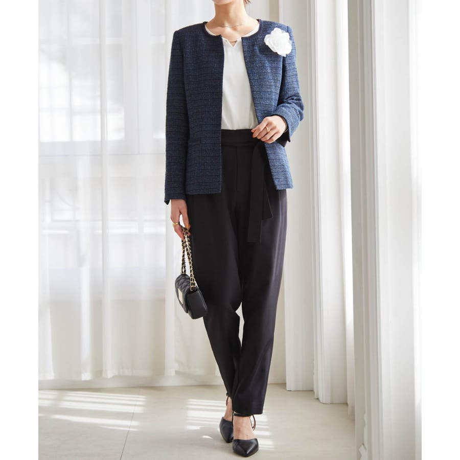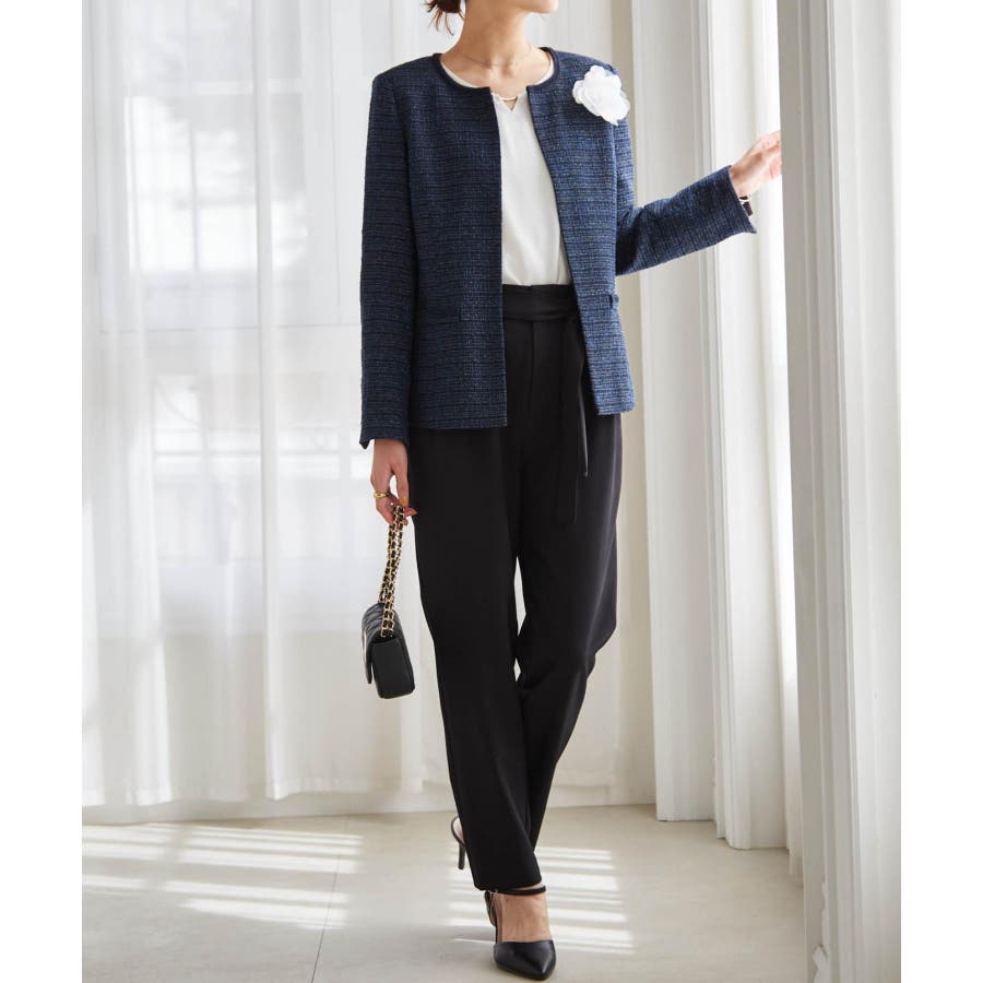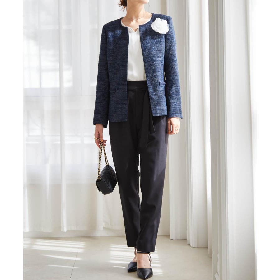 ネイビー系1:ネイビー系ジャケット+ホワイトブラウス+テーパードパンツ+コサージュ