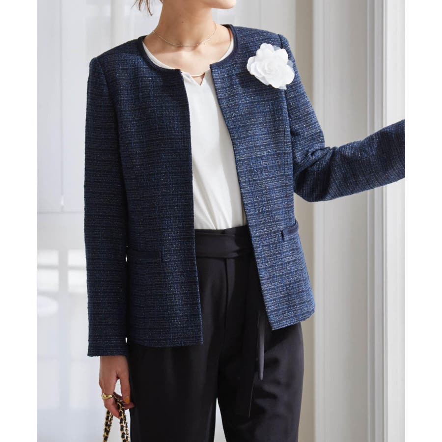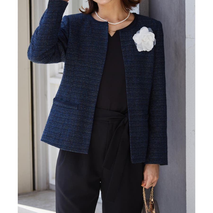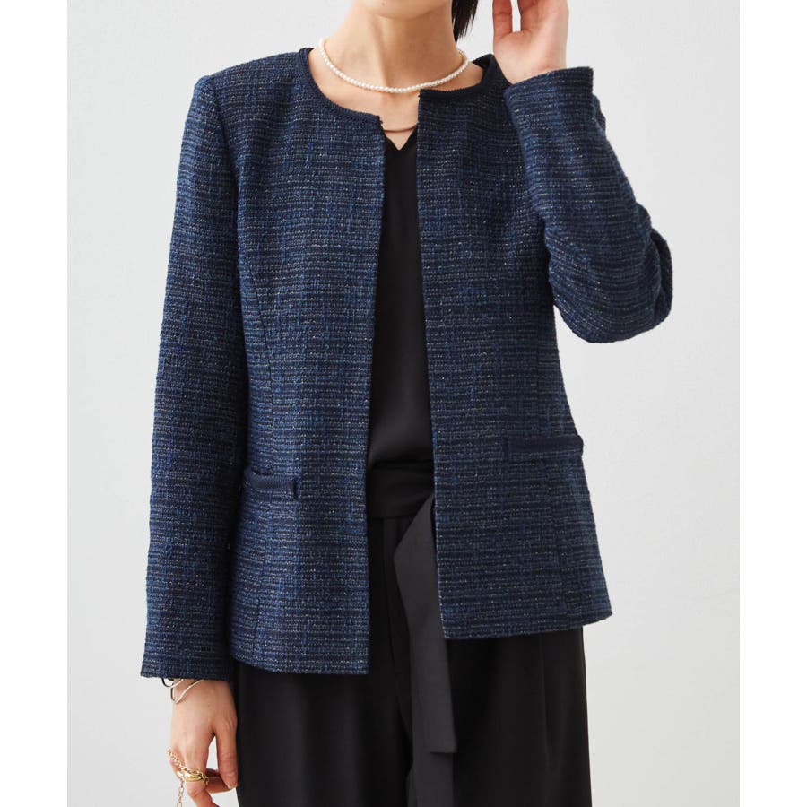 ラメのキラキラ感が印象的な、上品ノーカラージャケット。