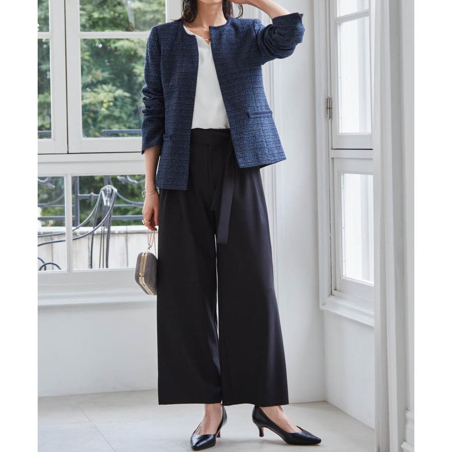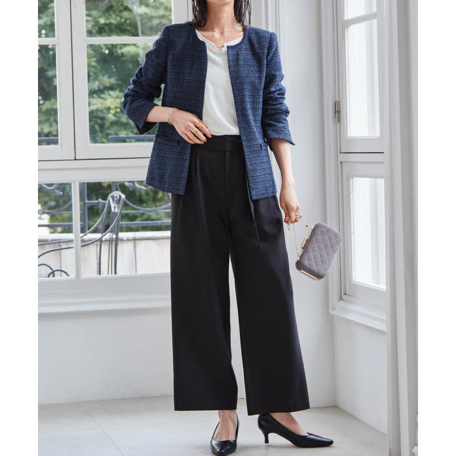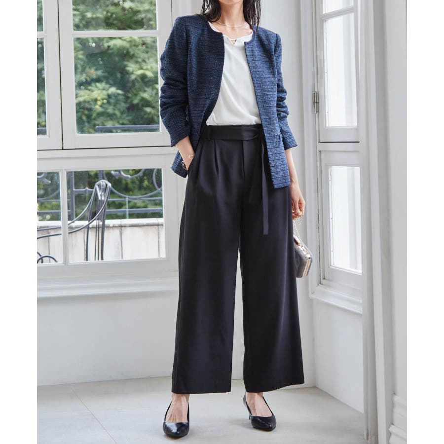 ネイビー系2:ネイビー系ジャケット+ホワイトブラウス+ワイドパンツ+コサージュ