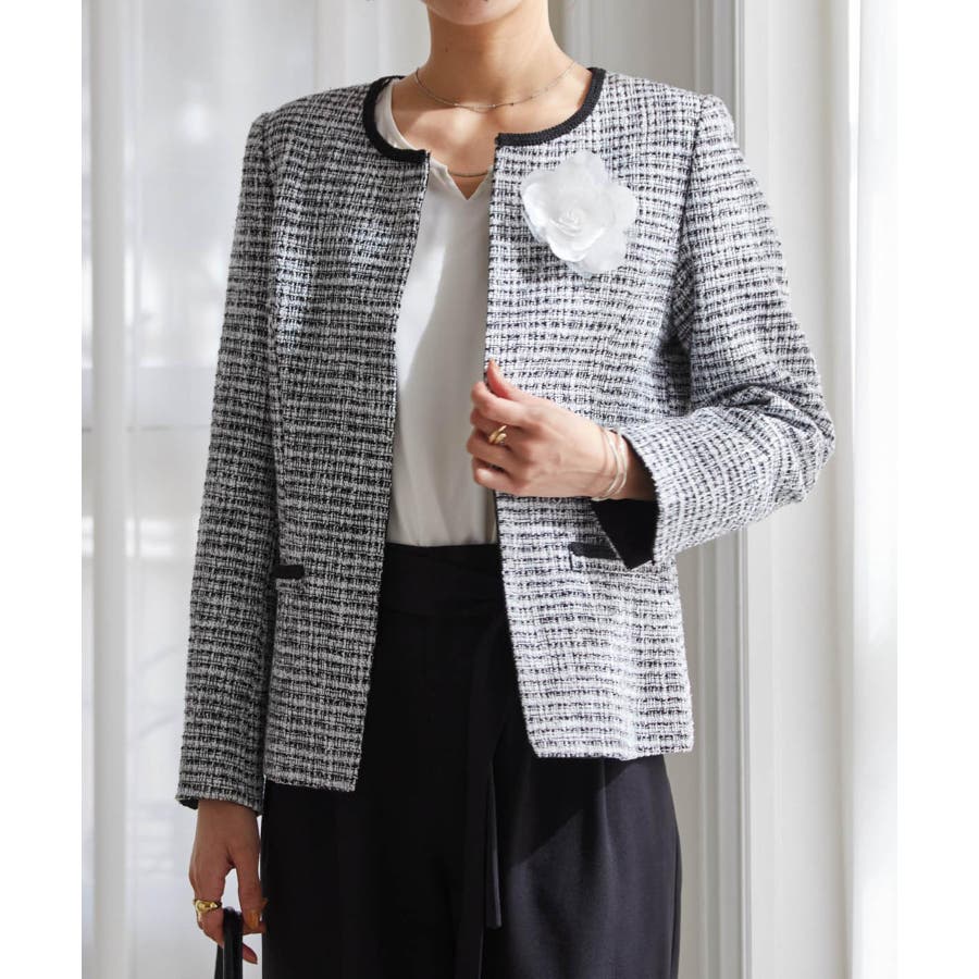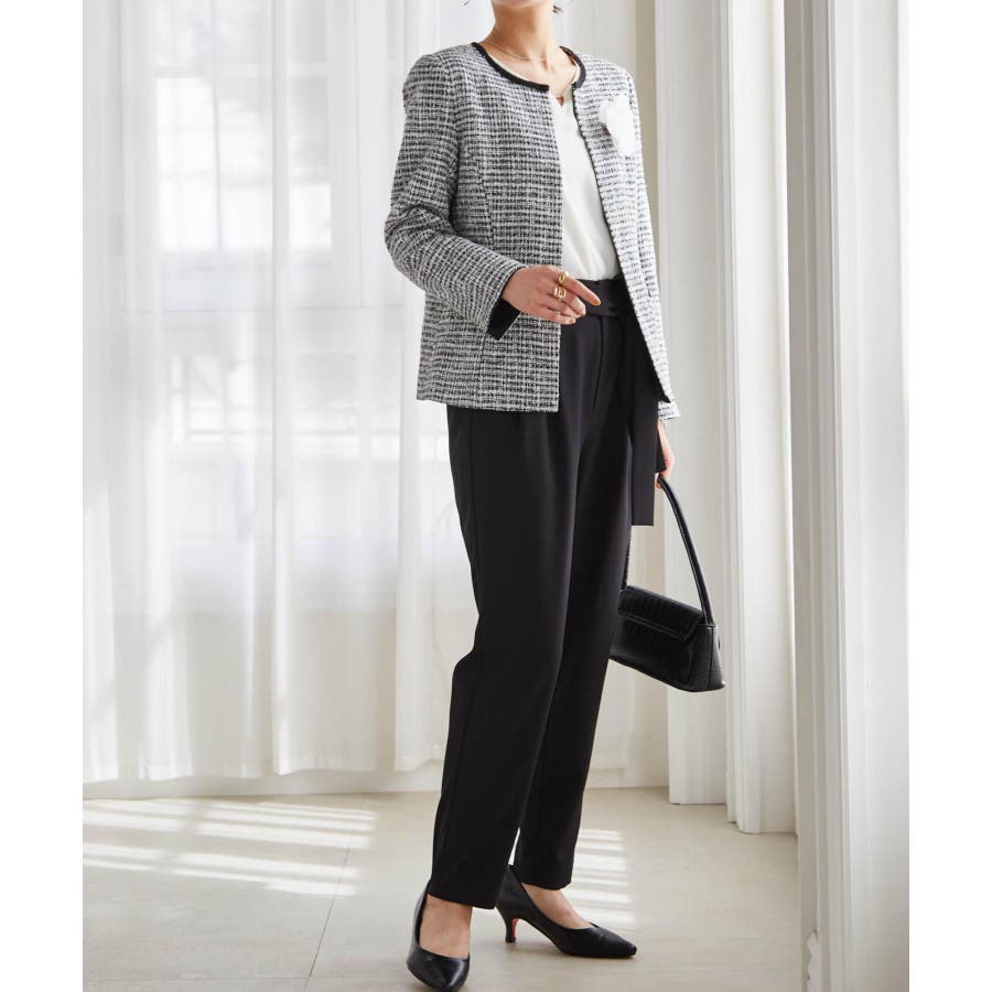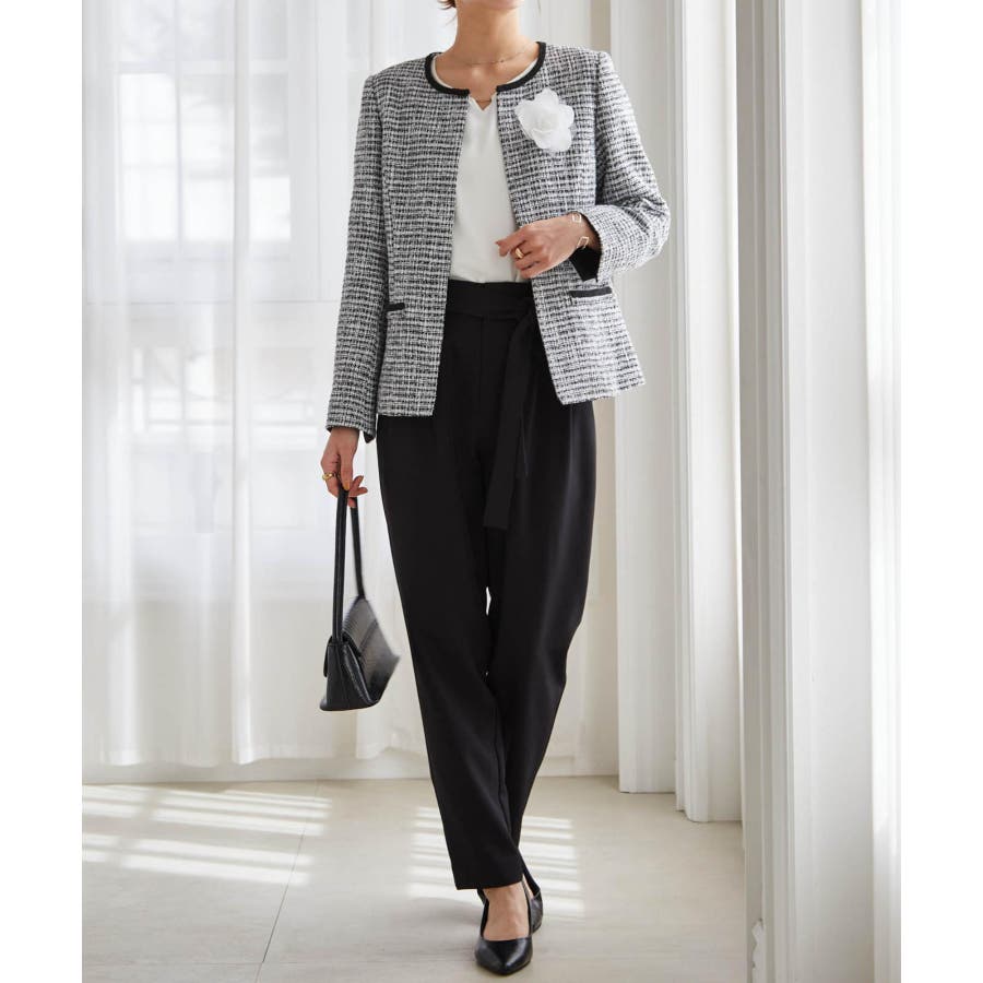 ホワイト系1:モノトーン系ジャケット+ホワイトブラウス+テーパードパンツ+コサージュ