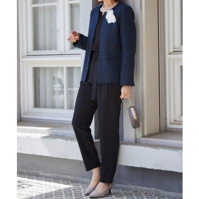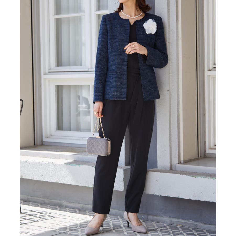 ネイビー系3:ネイビー系ジャケット+ブラックブラウス+テーパードパンツ+コサージュ