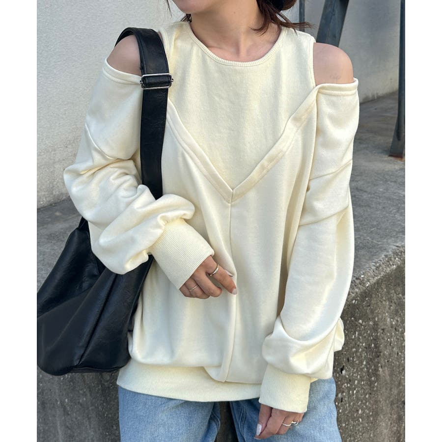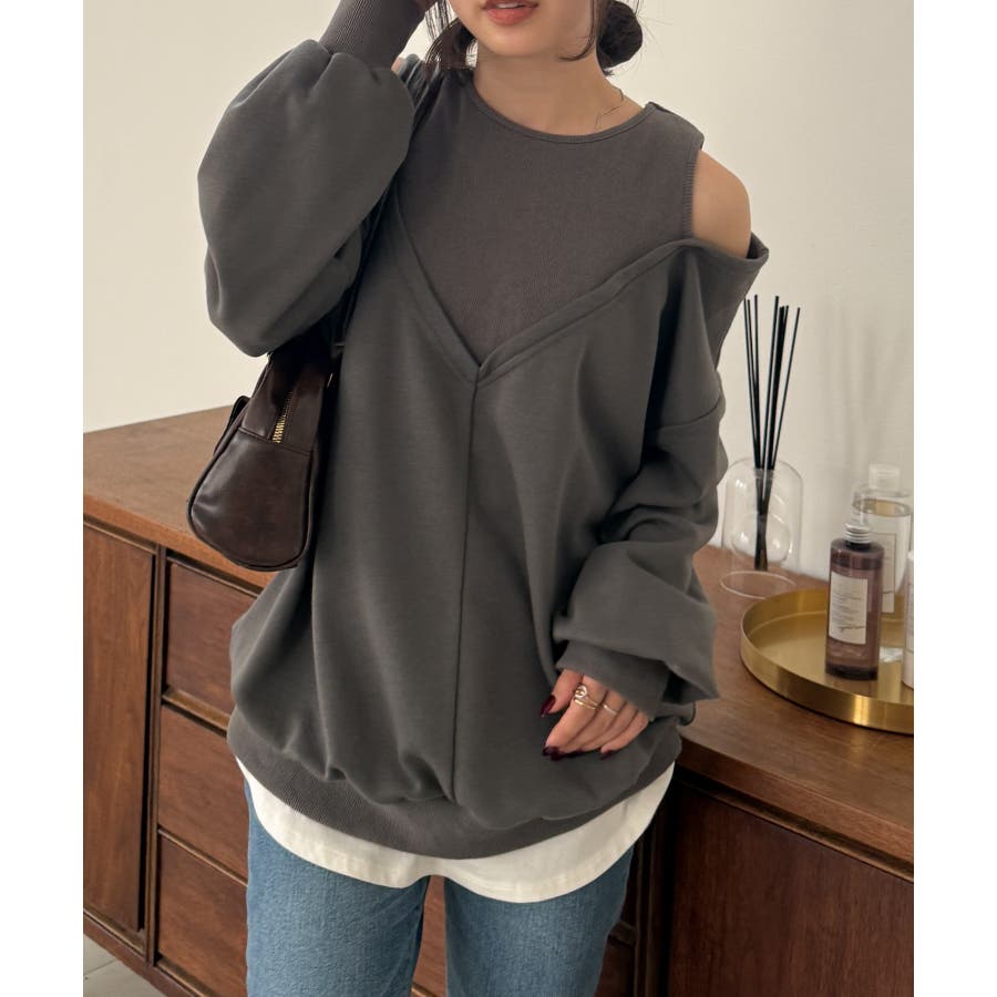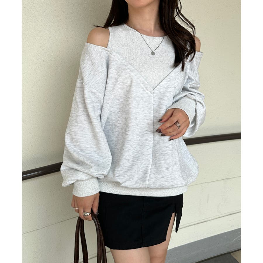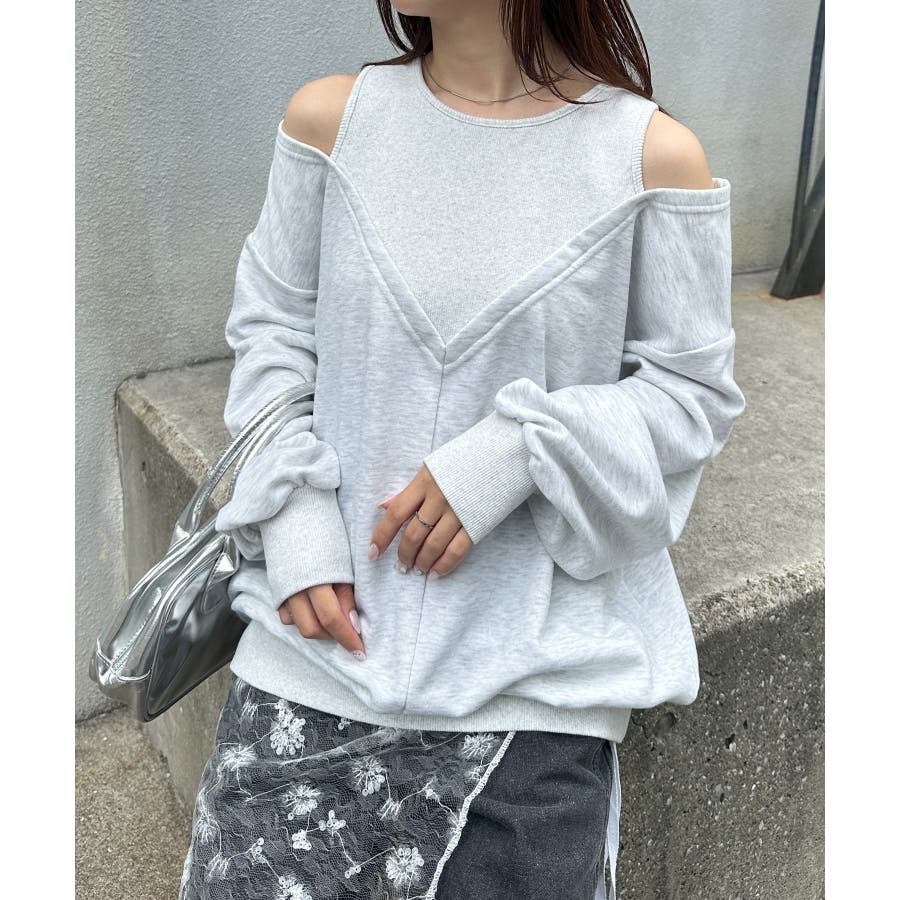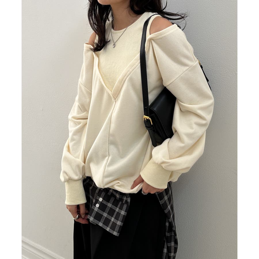また、さりげなく肌が覗くレイヤードデザインはスウェットをモードな表情に。