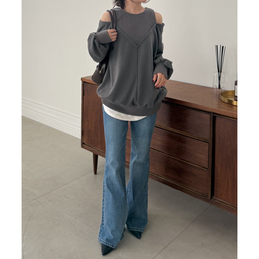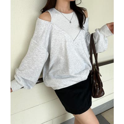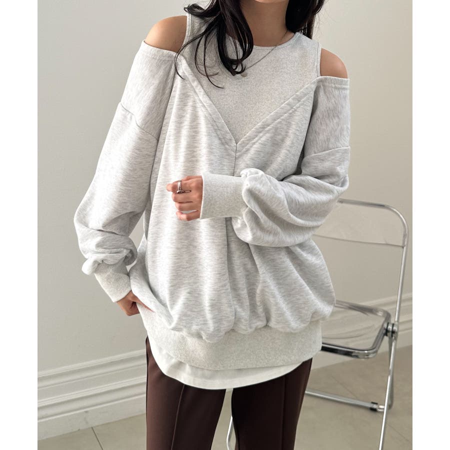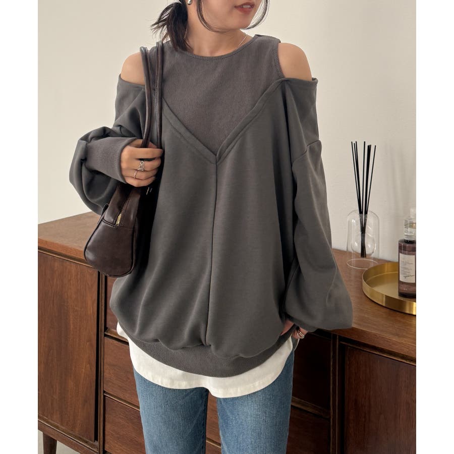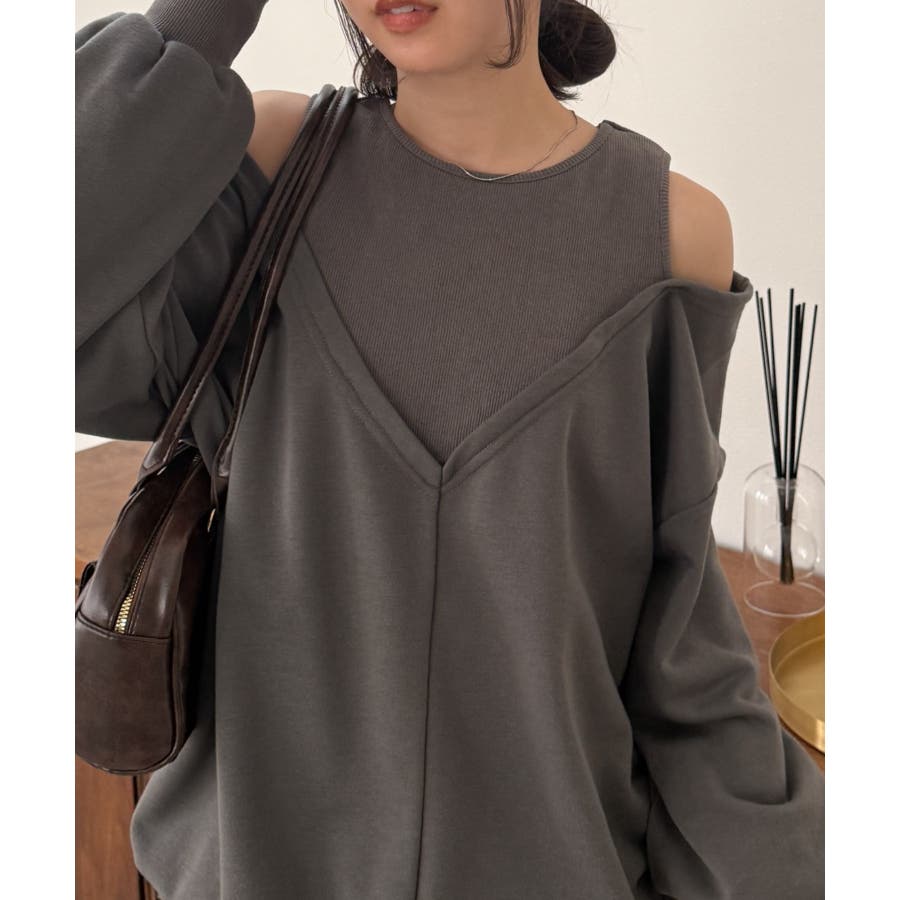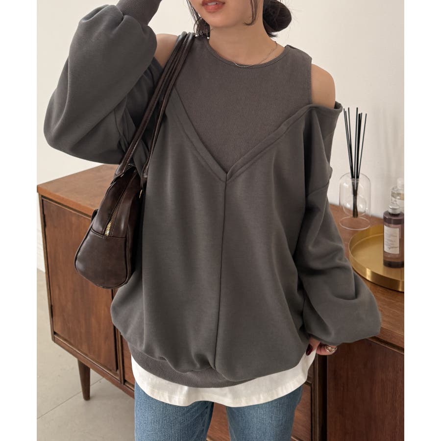 また、さりげなく肌が覗くレイヤードデザインはスウェットをモードな表情に。
