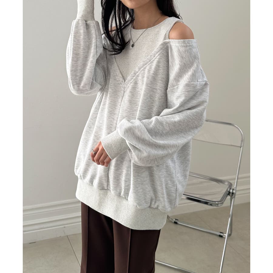 深めのVネックに、アメスリタンクをレイヤードしたようなデザインのスウェット。