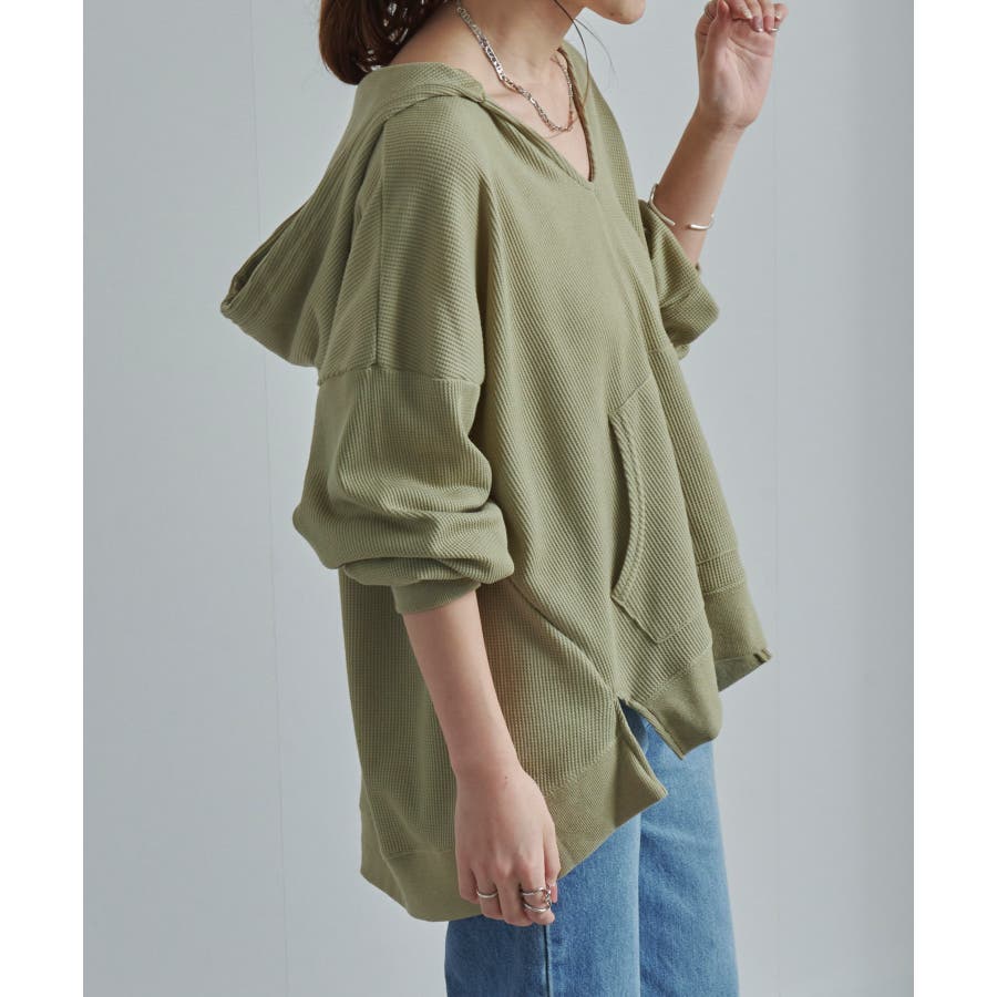 人気のワッフル素材で作ったプルパーカー。着丈も身幅もゆるっとしたサイジングでイージーな着心地ながらトレンド感はしっかり抑えた1枚です♪深めのVネックが今っぽさをプラス。サイドにはスリットが入っているのでロンTを覗かせればこなれ感のある着こなしに。