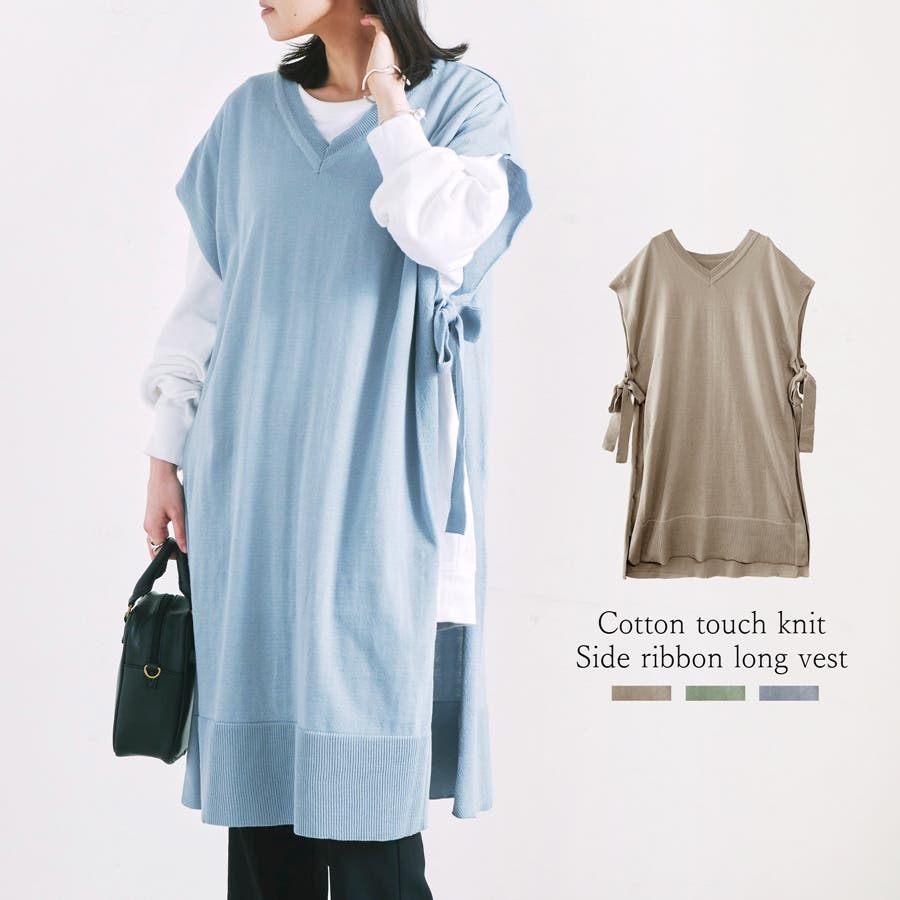 定番アイテムのニットベストもロング丈で違った印象に♪サイドリボンデザインが特徴的なトレンド感溢れるアイテムです。シンプルなコーデも華やかな印象に。コットン素材のような柔らかい肌触りの"コットンタッチニット"。程よい肉感で、気温に合わせて調整しやすく、Tシャツやシアー素材のトップスと組み合わせてシーズンレスにお使いいただけます◎