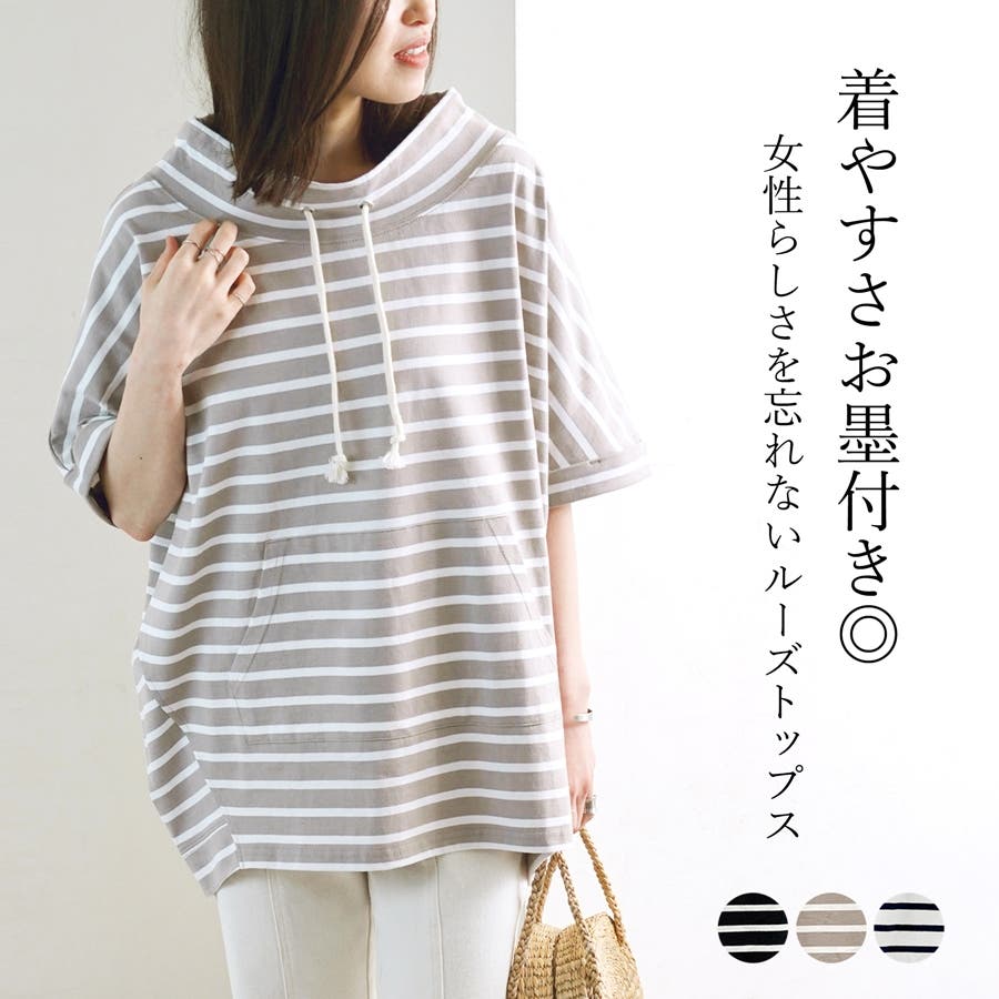 【ボーダー柄ルーズハイネックプルオーバー】