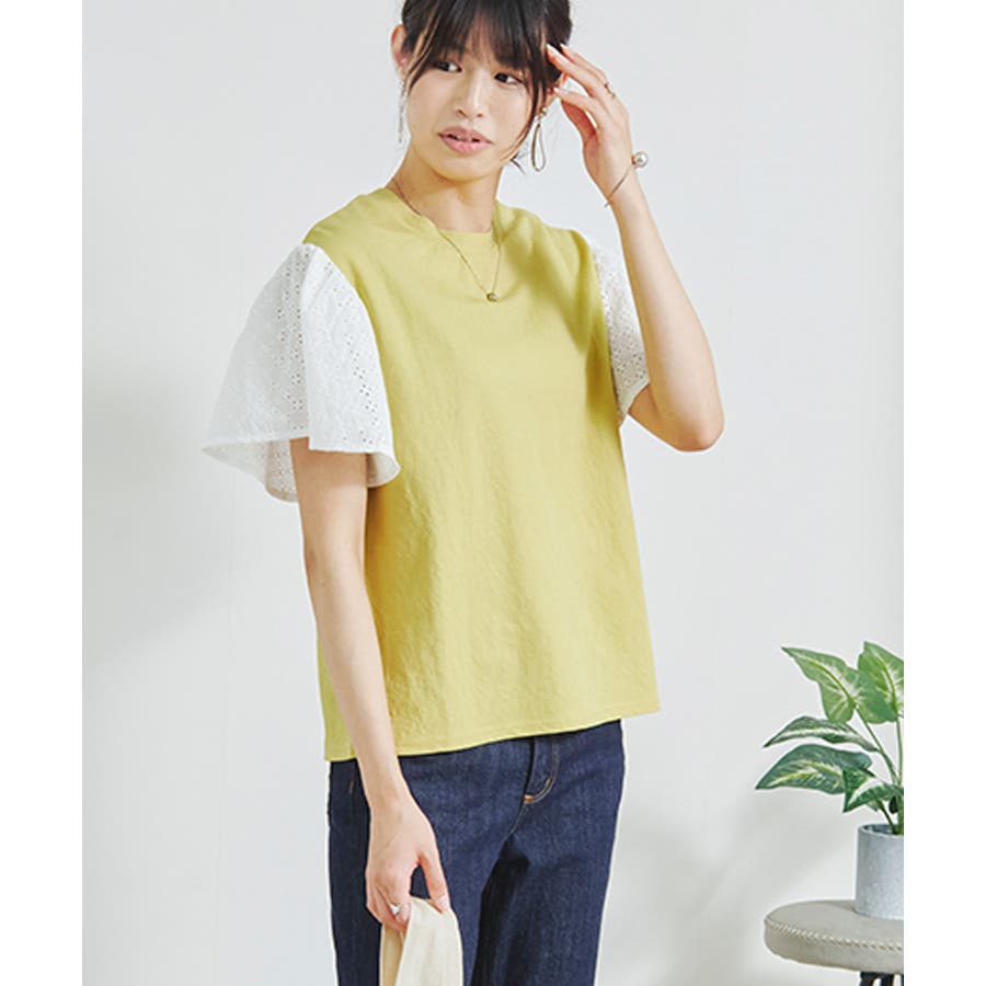 カット素材のレース袖トップスは、オフィス使いはもちろんデイリーユースにも◎
