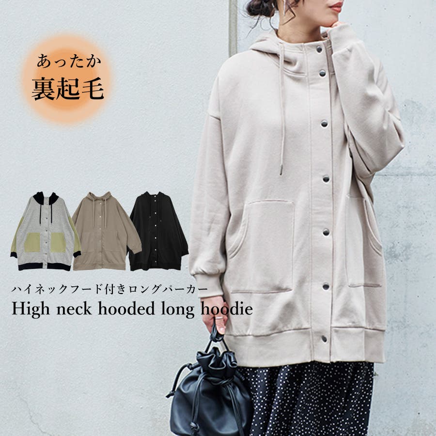【あったか裏起毛 ハイネックフード付きロングパーカー】