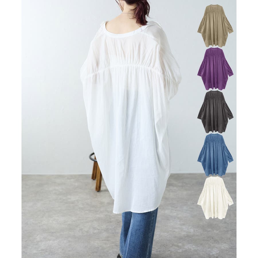 バックヨーク部分にたっぷりとギャザーを寄せることで立体感のあるシルエットに仕上げたオシャレ見えブラウス。