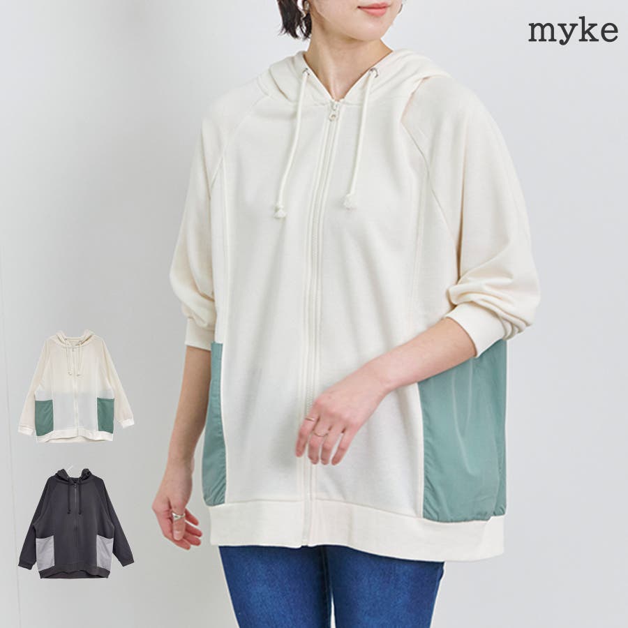 身頃に大胆な異素材切替えを施したZIPパーカー。