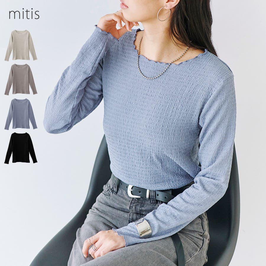 襟や袖口のメローフリルがカジュアルになりすぎない映えトップス。