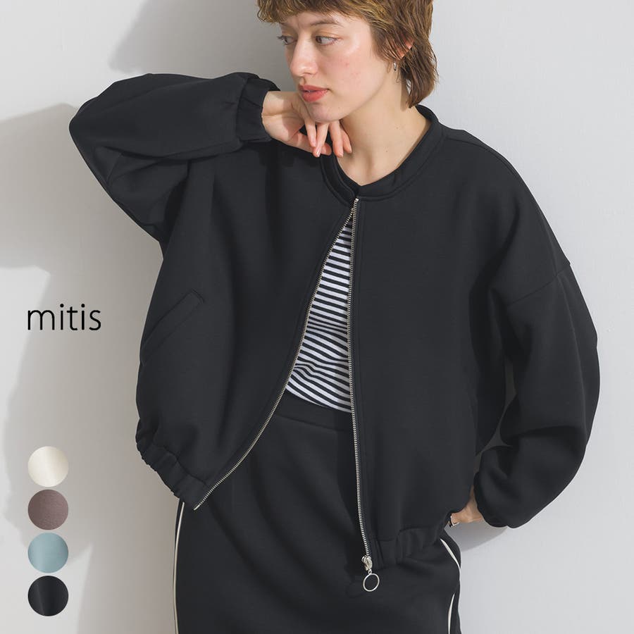首元はすっきりとしたバンドカラー仕様。顔まわりをシャープに見せつつ、落ち着いた大人の雰囲気を演出します。フロントはジップ開閉で、さっと羽織れる利便性も魅力。程よい着丈でバランス良く着こなせます。