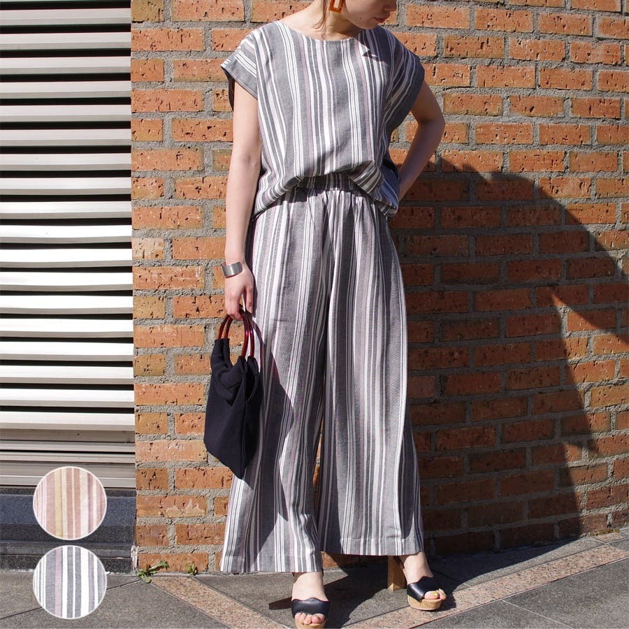 【麻ライクランダムストライプ柄セットアップ】