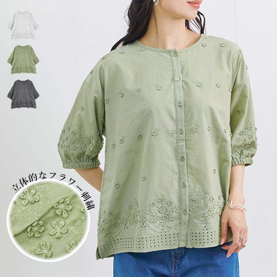 【カットソー レディース 五分袖 春 夏 フラワー 3D 刺繍 布帛 切替え 大人 体型カバー ゆったり 20代 30代 40代 50代】