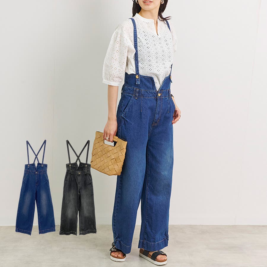 【デニムハイウェストサスペンダーワイドパンツ】
