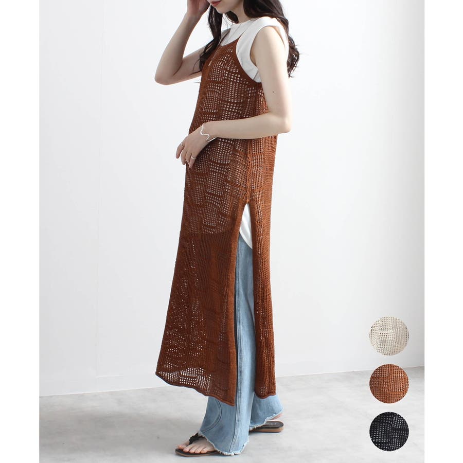 ランダムなメッシュ編みが特徴的なニットワンピース。Iラインを強調してくれるストレートシルエットはスタイルアップして見せてくれます。サイドにはざっくりとスリットが入っているので歩きやすいのが嬉しい。華奢なストラップは様々なトップスと組み合わせやすく、旬のレイヤードスタイルが楽しめます。手軽にイメージが変えられるキャミワンピースはこれからの時期のマストアイテムです。