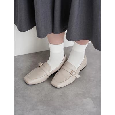 ビジューがあしらわれたバックルが足元のワンポイントになるローファー。