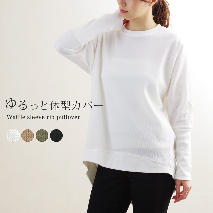 ラフに着られるワッフル素材が大人のカジュアルコーデにぴったりの一枚。ロングデザインの袖リブが、ドルマンスリーブをすっきり見せてくれます。後ろが長いシルエットになっているので、気になる腰回りをカバーしてくれる優秀さもポイント。