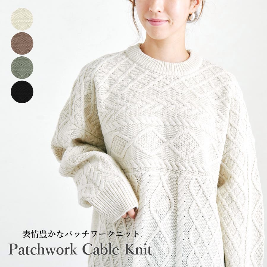 【パッチワークケーブルニット チュニック丈プルオーバー】