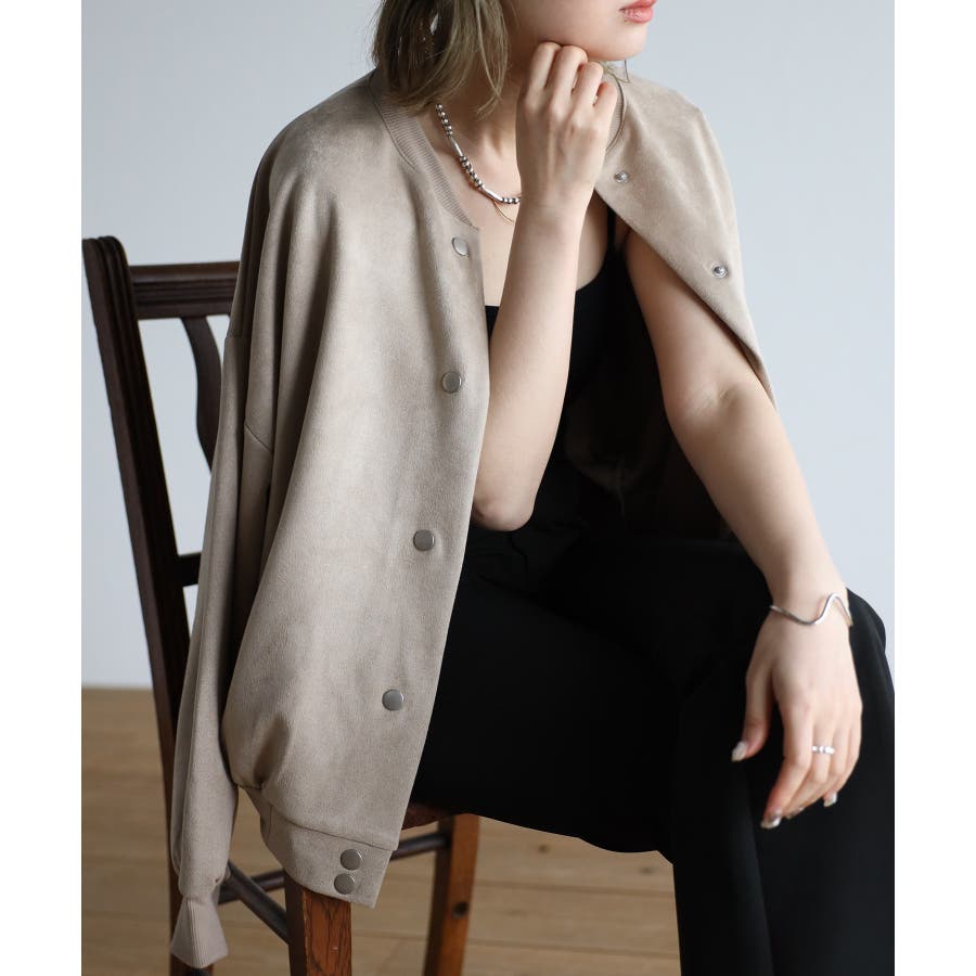 カジュアルなデザインのスタジャンを、高級感のあるスエード素材で仕上げ、女性らしいコーデも楽しめるよう仕上げました。スナップボタンで着脱もスムーズ。少しゆったりとしたサイズ感なので、ボリュームがあるトップスやニットの上から着てもごわつきが無く着ていただけます。スカートやデニムを合わせるだけで旬な着こなしが完成!