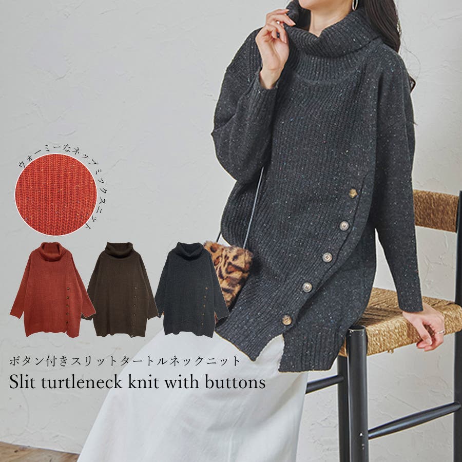 【カラーネップ ボタン付きスリットタートルネックニット】
