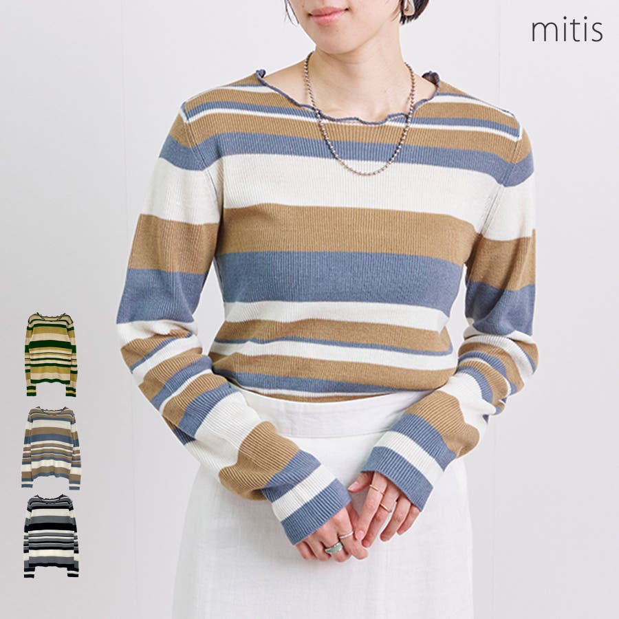 【カラーマルチボーダー メロークルーネックリブニット】