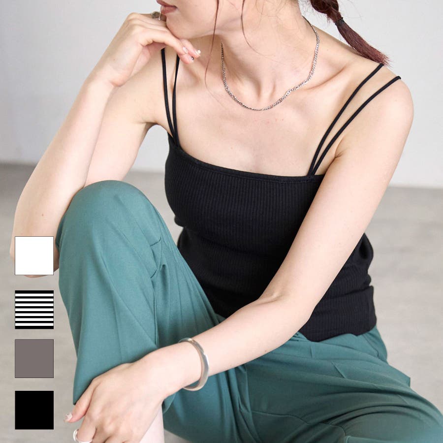 繊細なダブル紐付きのディテールで、お洒落かつ安定感を与えてくれるカップ付きキャミソール。しわになりにくいポリエステルやナチュラルな風合いのコットンなどをミックスした生地で、使い易さも抜群な仕上がりです。抜けも引き締めも担う万能色のカラー展開が使い勝手抜群なアイテム◎