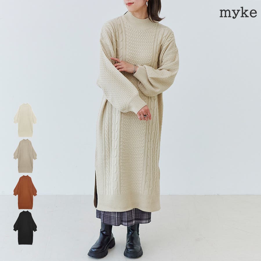 ざっくりとした鹿の子編みともこもこのケーブル編みのコンビが印象的なニットワンピース。