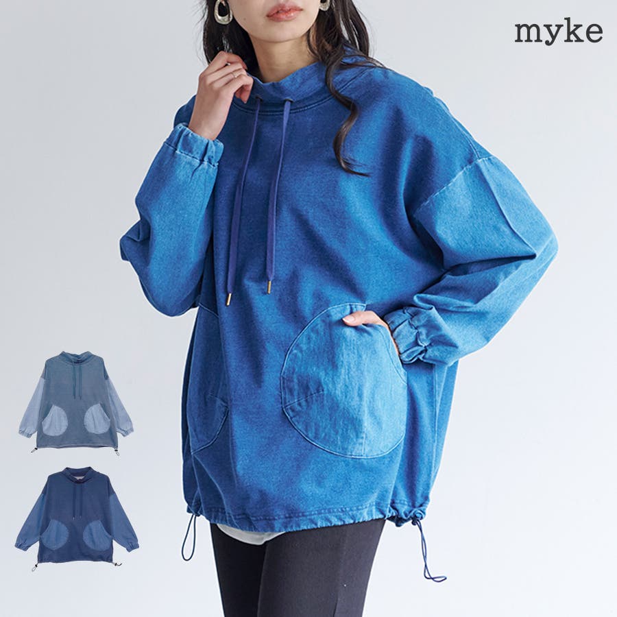 【インディゴ裏毛 ルーズハイネック袖布帛裾ドロストプルオーバー】