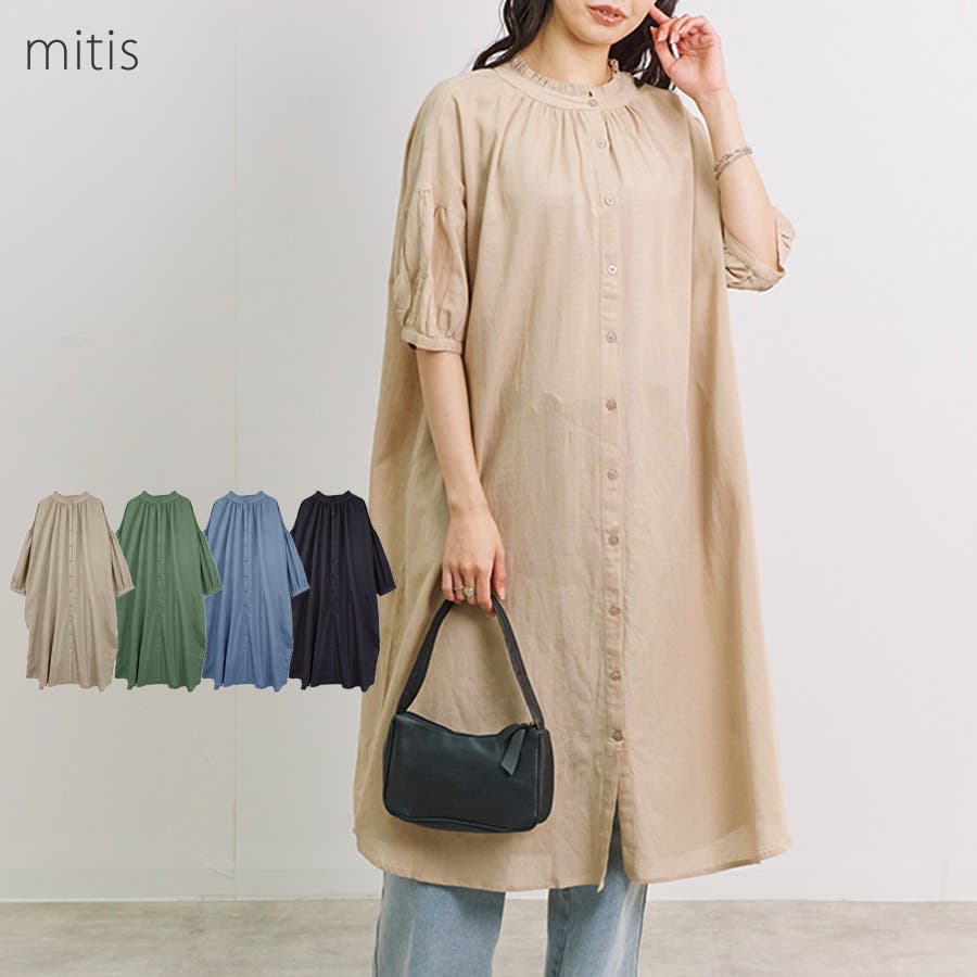 【シャツワンピース 春 夏 半袖 ロング ぽわん袖 スタンドカラー ゆったり ふんわり 大人 羽織り 綿麻ミックス 衿プリーツ ボリューム袖 レディース 30代 20代 40代】