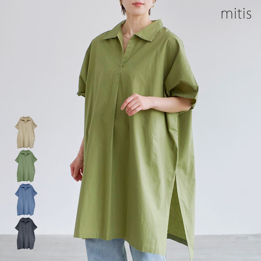 【チュニック レディース ドルマン 綿ポプリン スキッパー Vネック シャツ ブラウス ロング 体型カバー ゆったり 20代 30代 40代 50代】