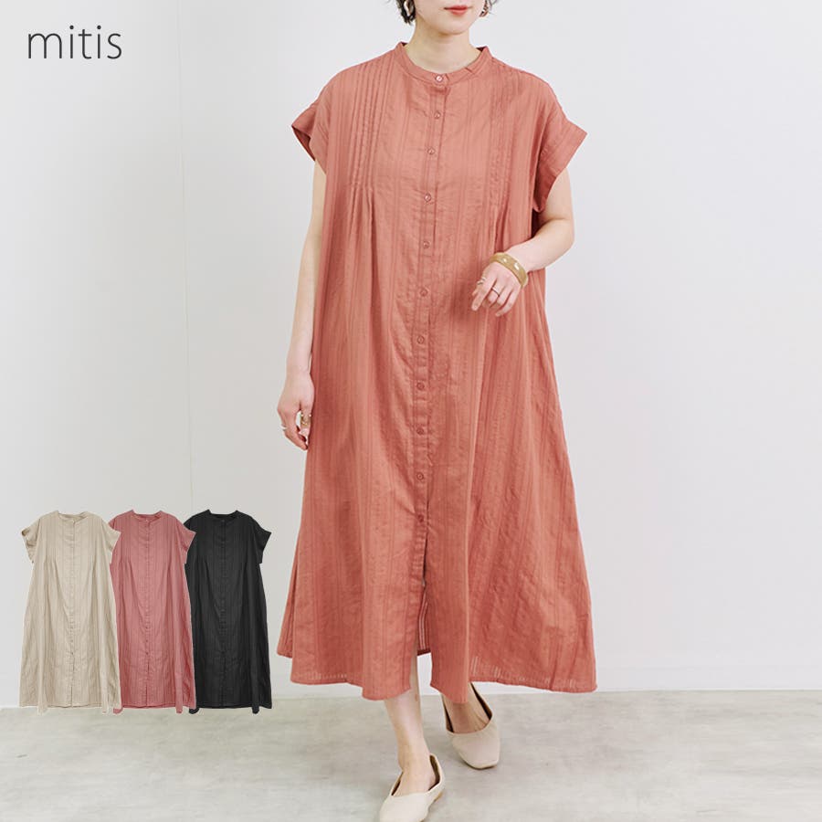 【ワンピース レディース ロング丈 フレンチスリーブ 綿 ドビー ピンタック シャツ 大人 体型カバー ゆったり 20代 30代 40代 50代】