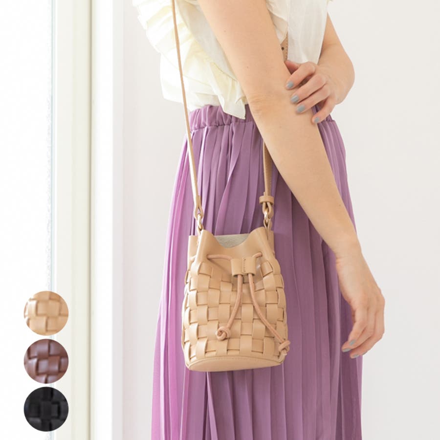 編み込みのバケツにドローコードのデザインがアクセントのバケツショルダーバッグ。ころんとした小さめサイズがお出かけにぴったりです。
