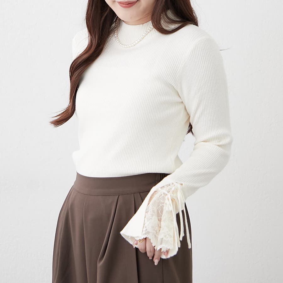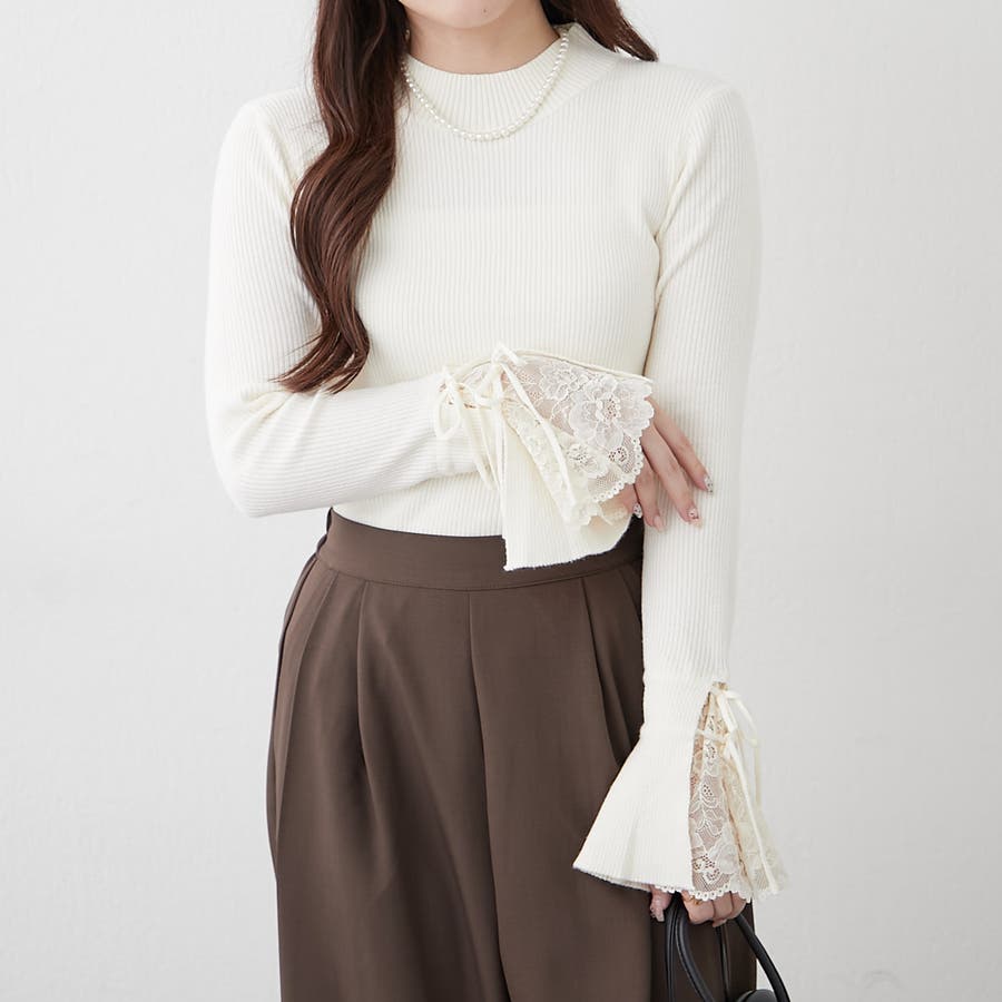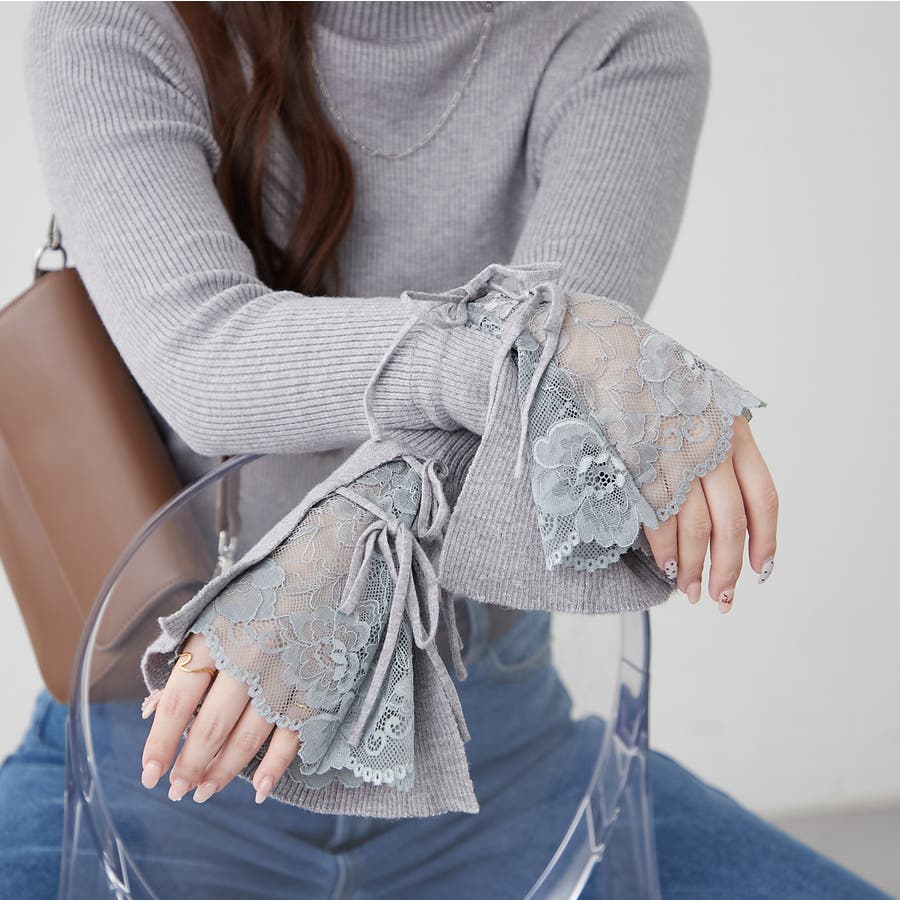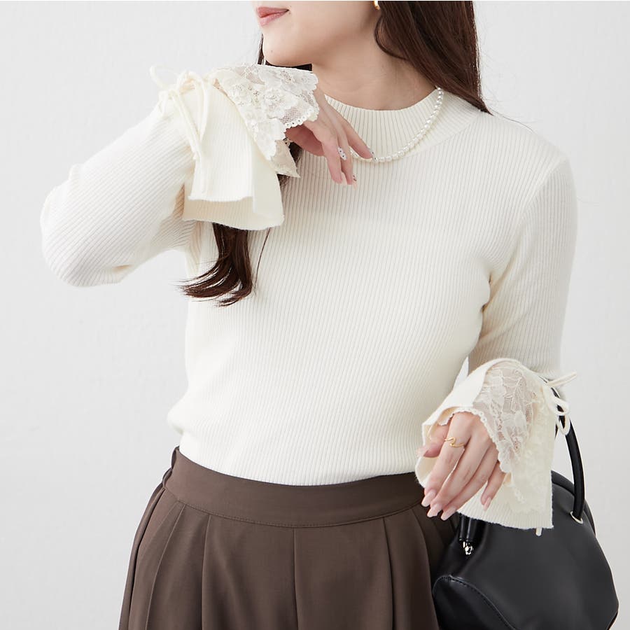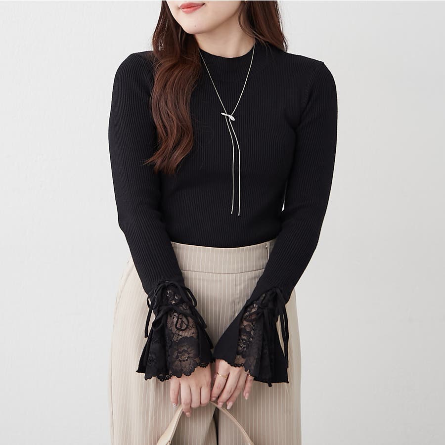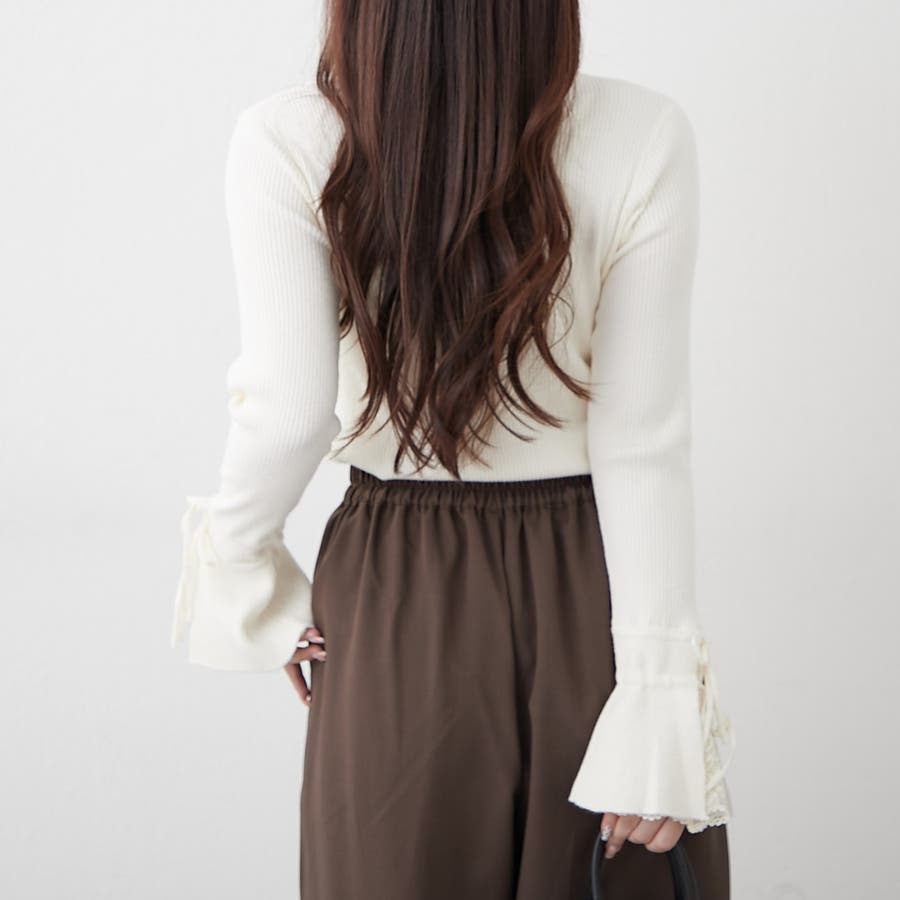 手元まで華やかに可愛く。袖レース&リボンニットトップス