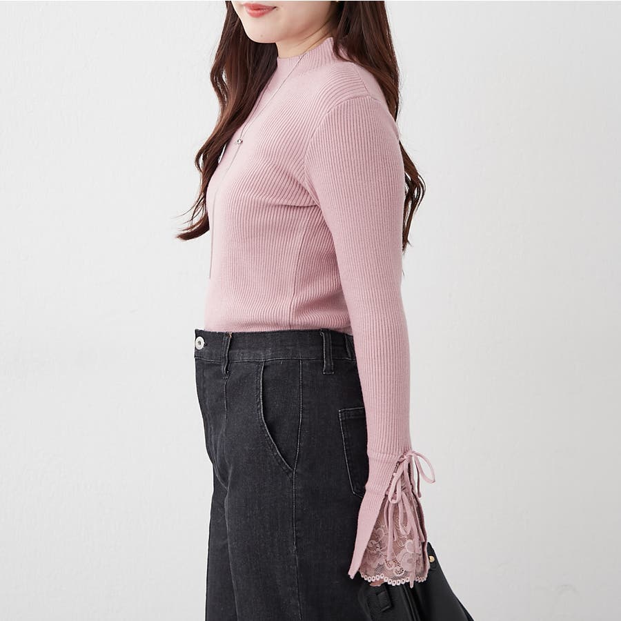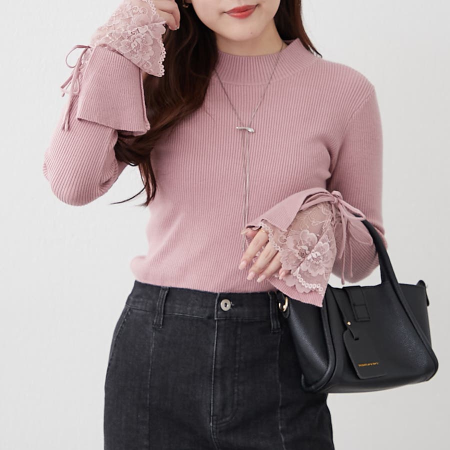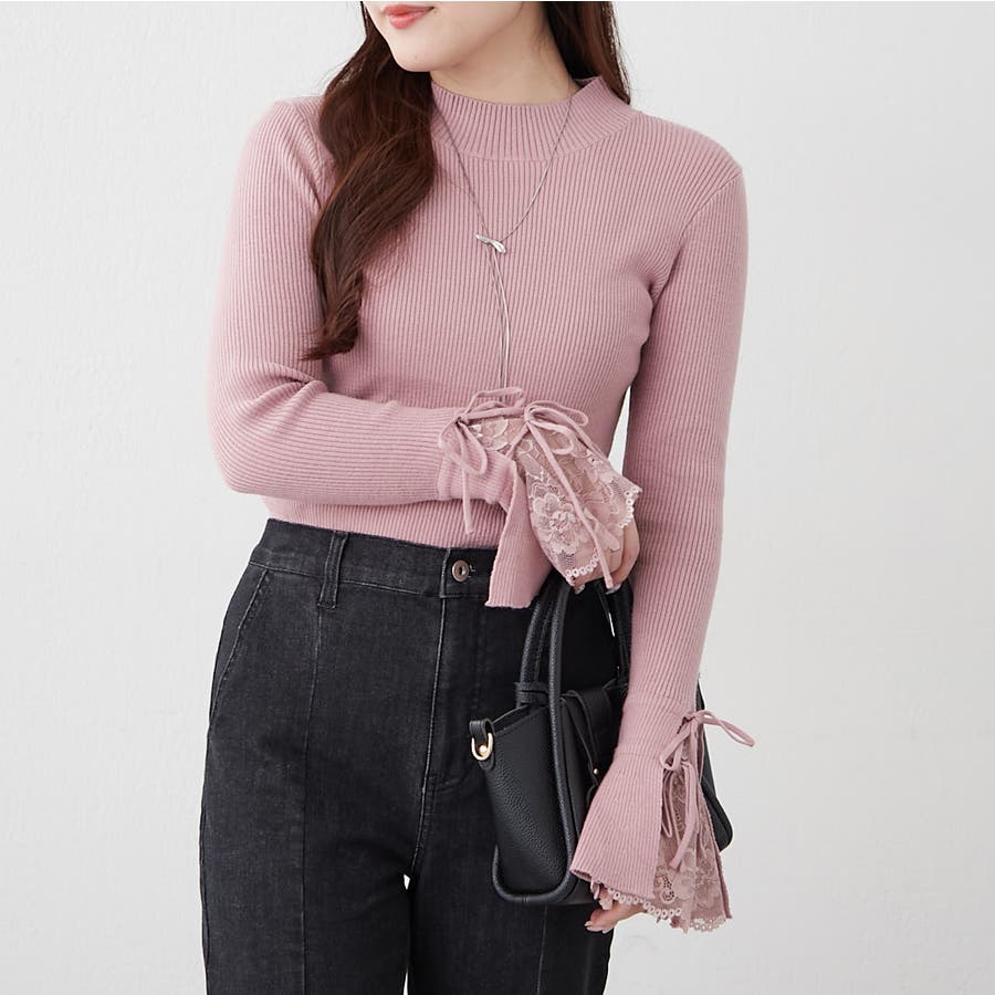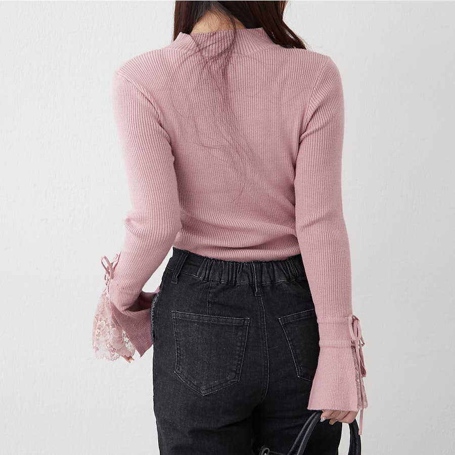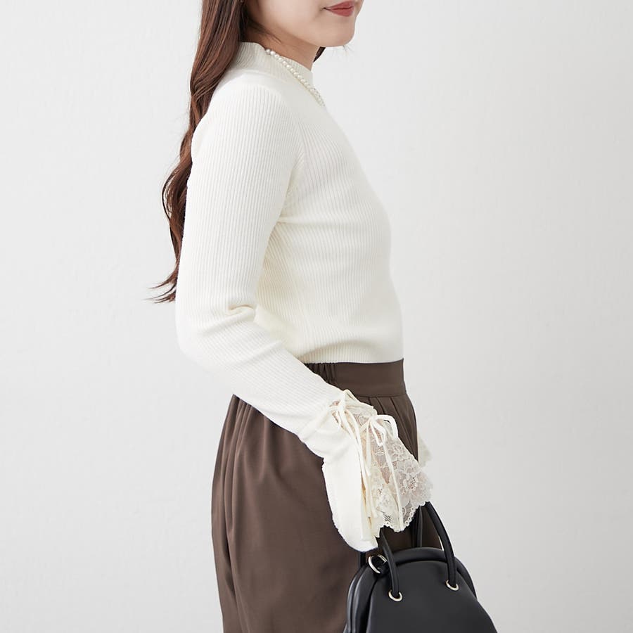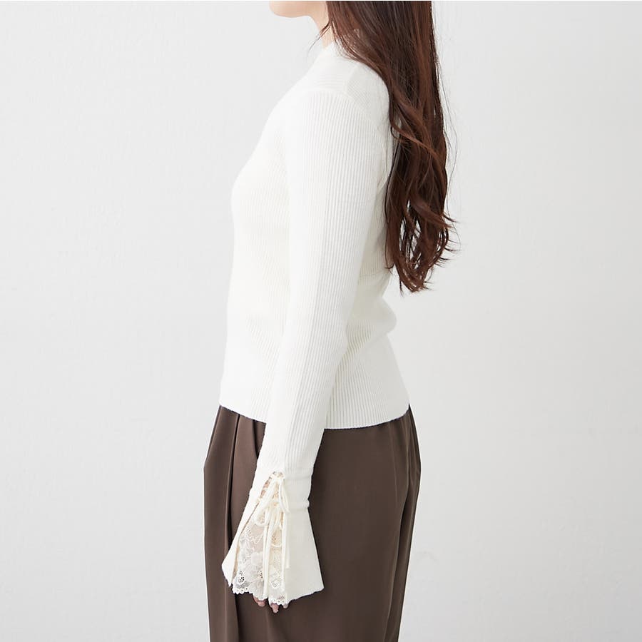 手元まで華やかに可愛く。袖レース&リボンニットトップス