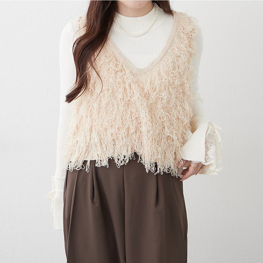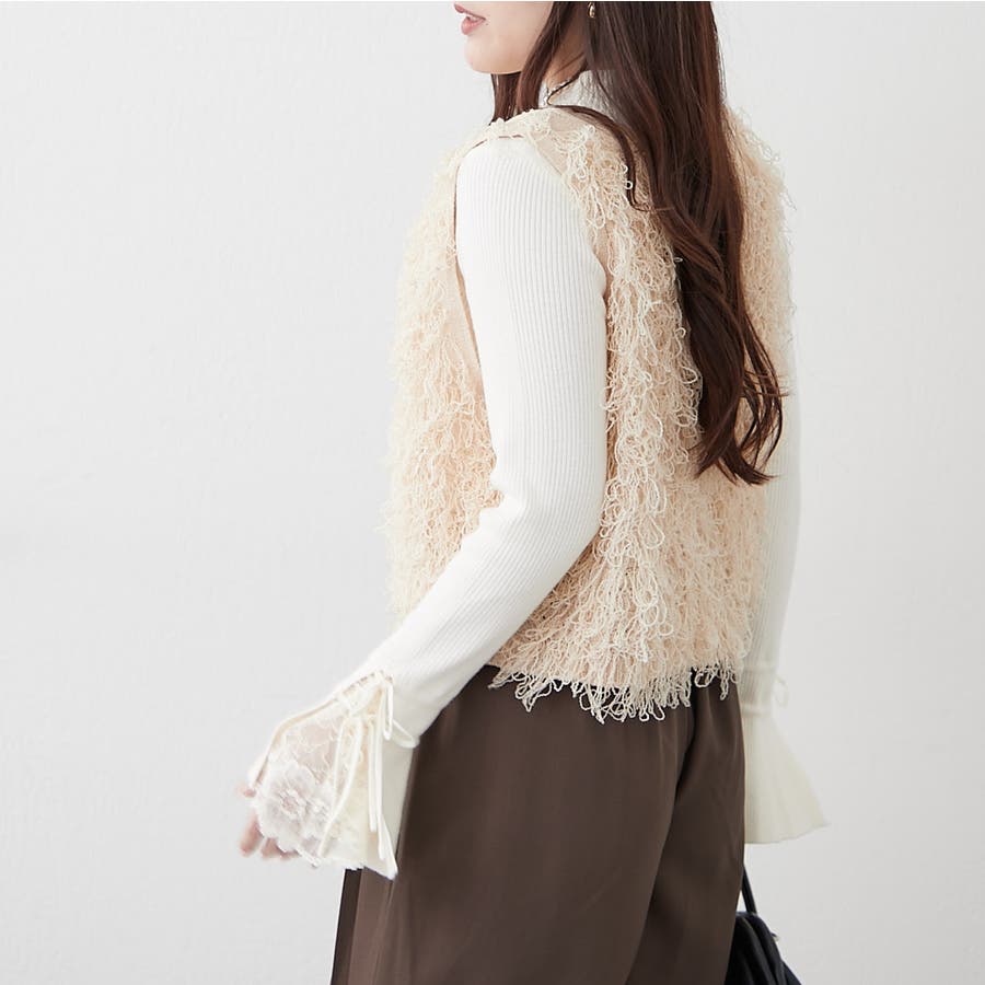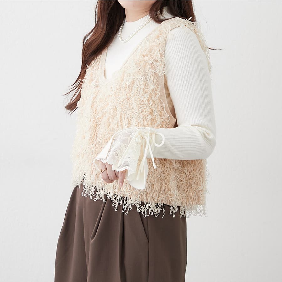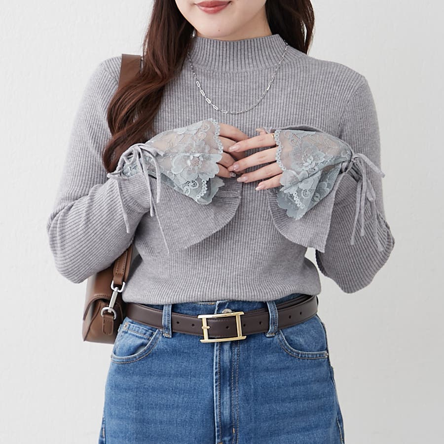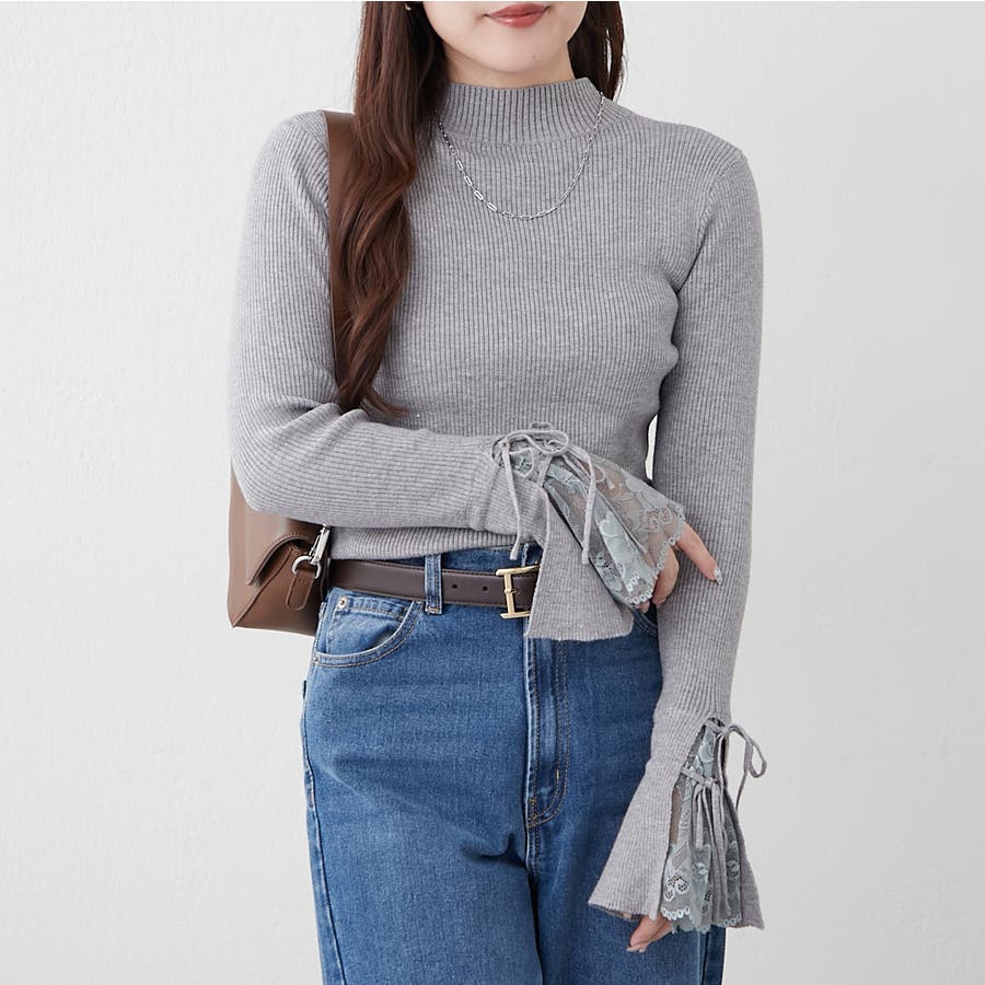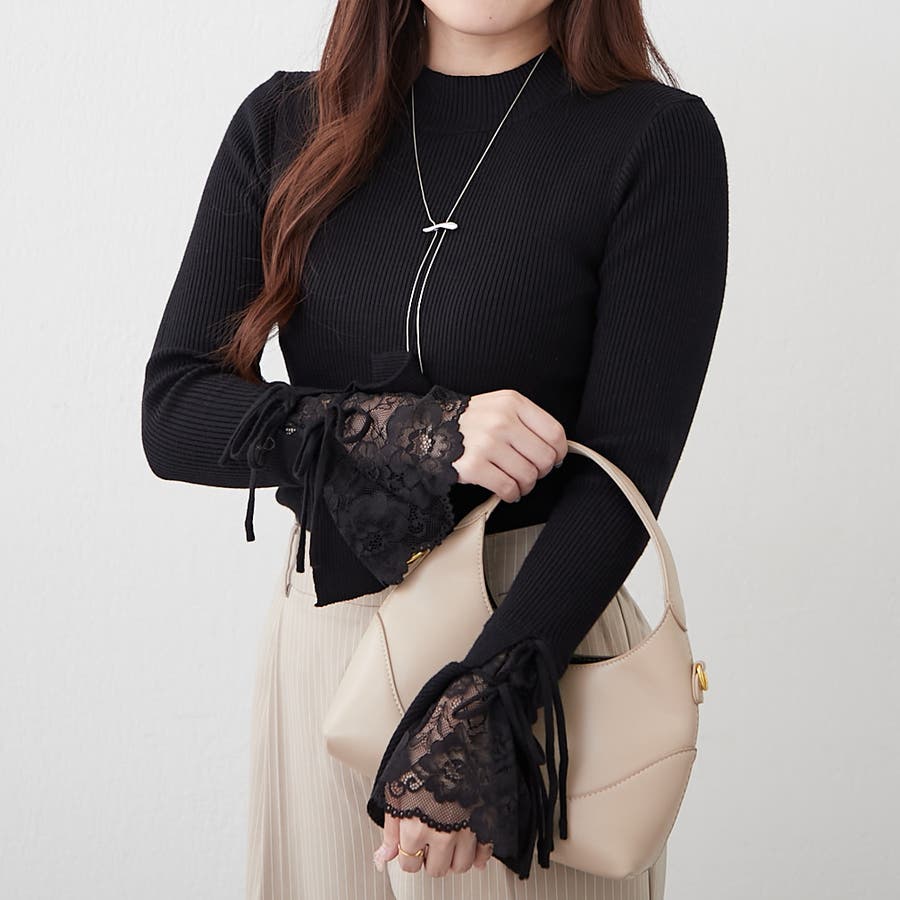 手元まで華やかに可愛く。袖レース&リボンニットトップス