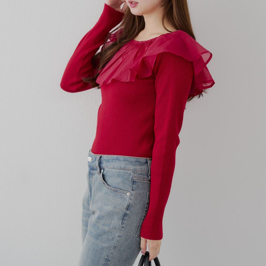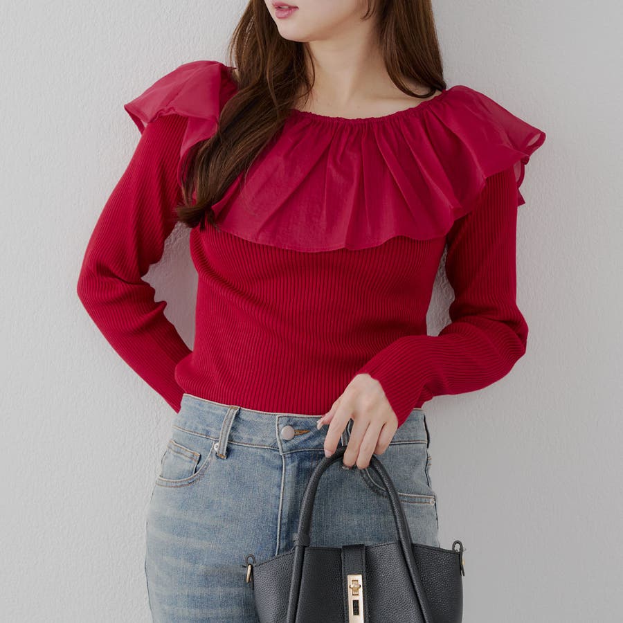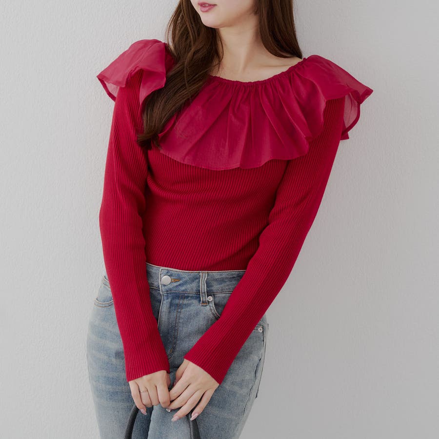 ・細身のリブニットに大きめのフリル襟が付いたアイテム。