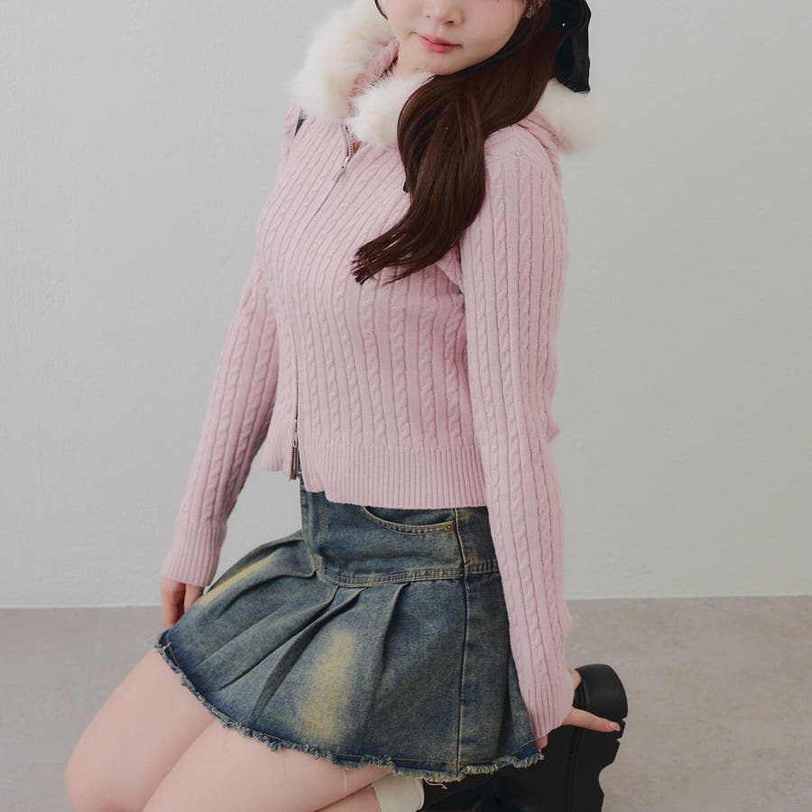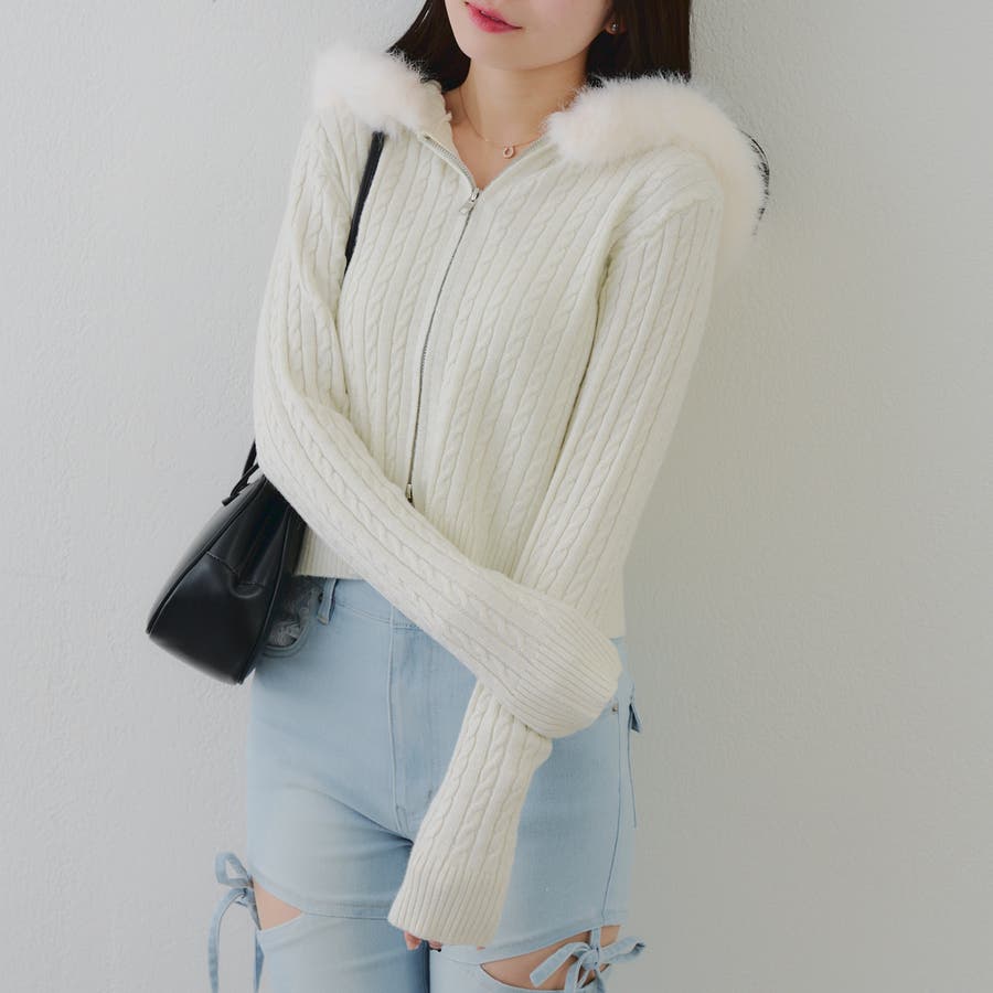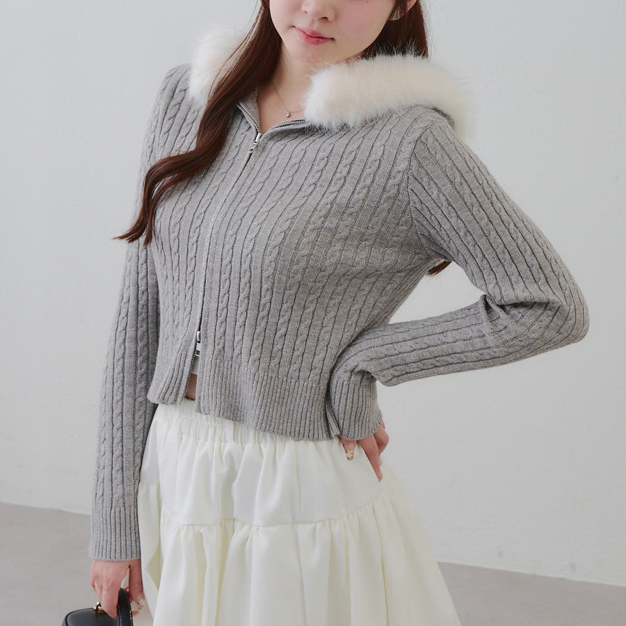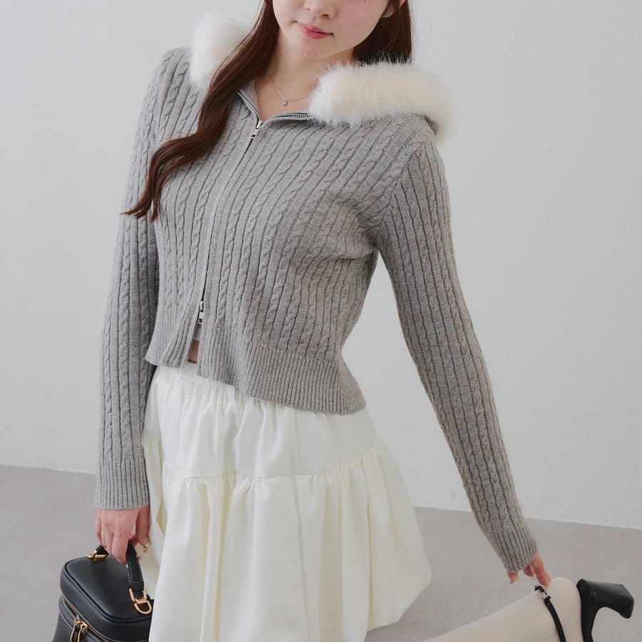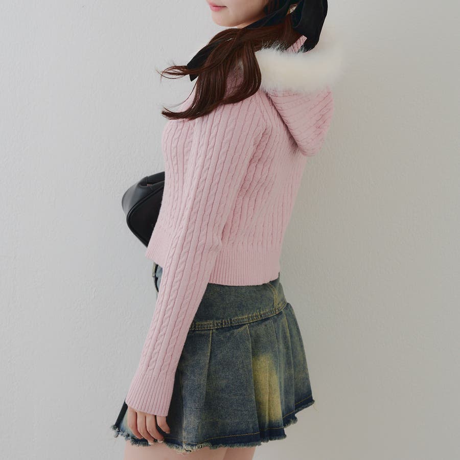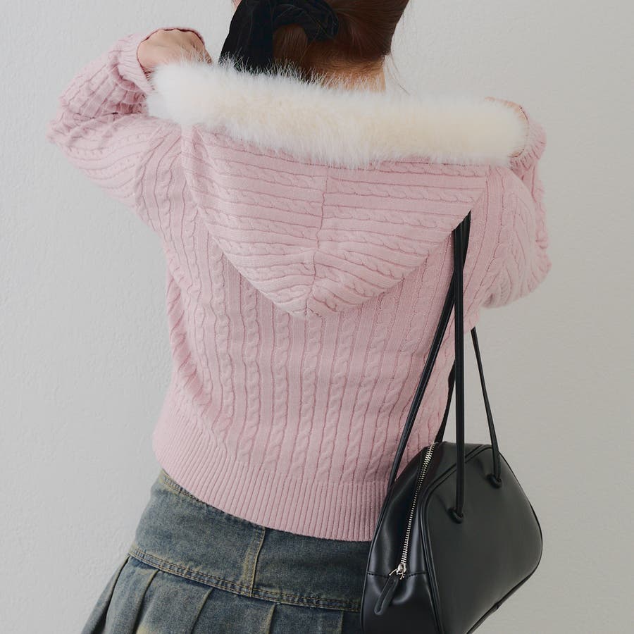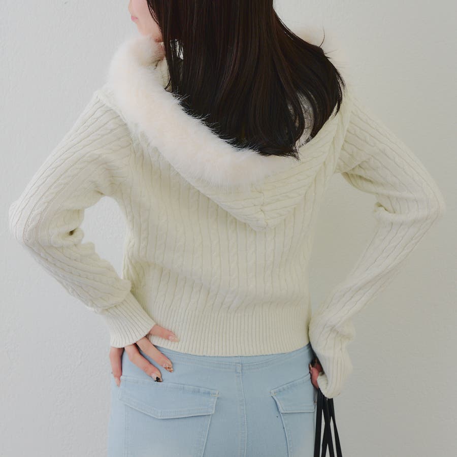 ・フードについたファーが可愛いケーブルニットのパーカー。