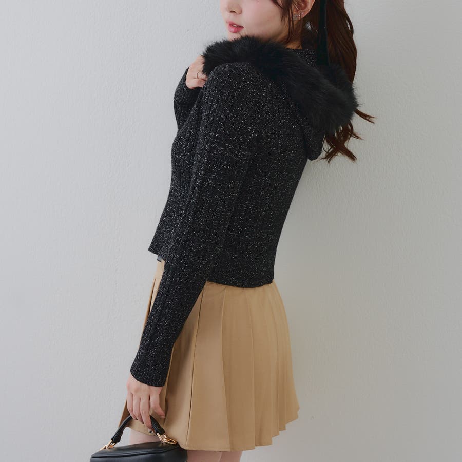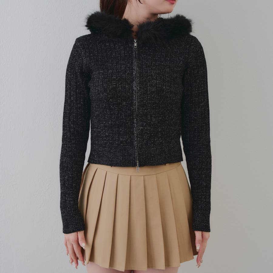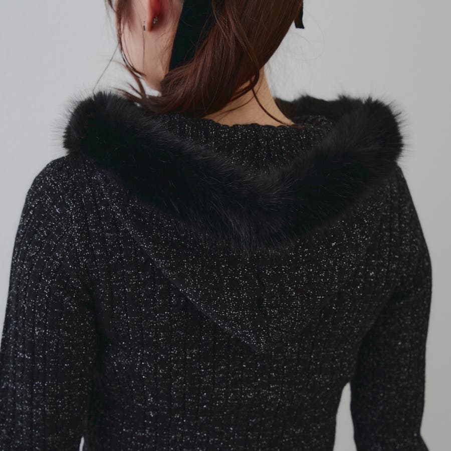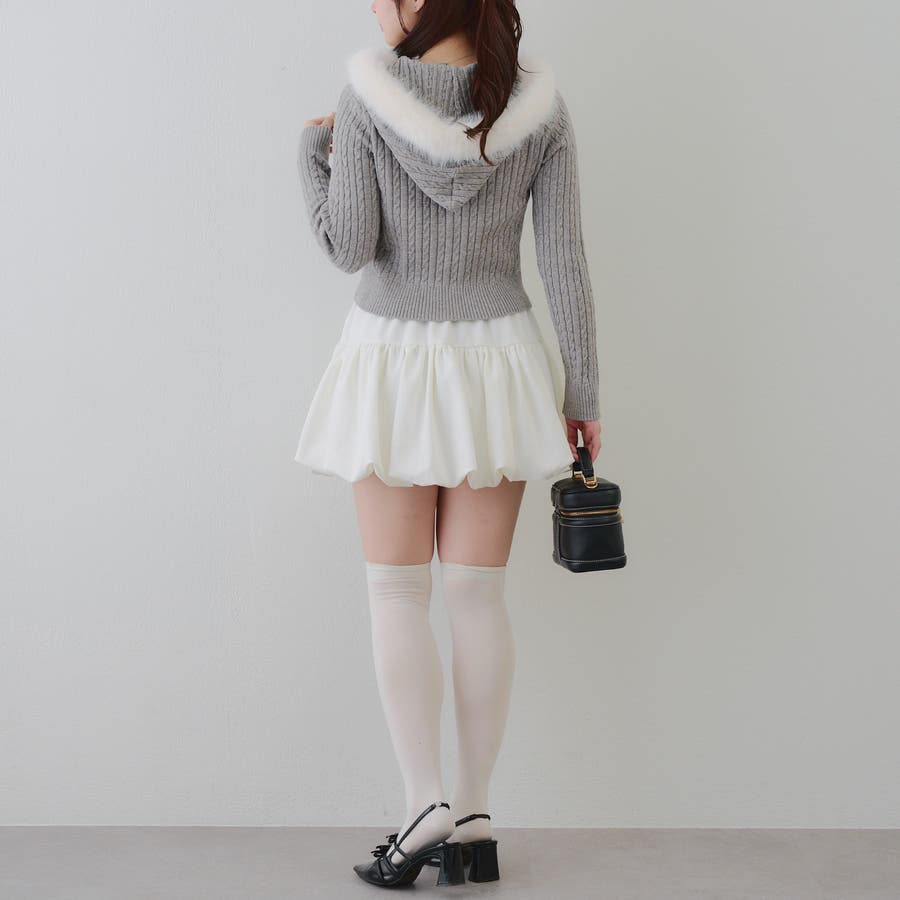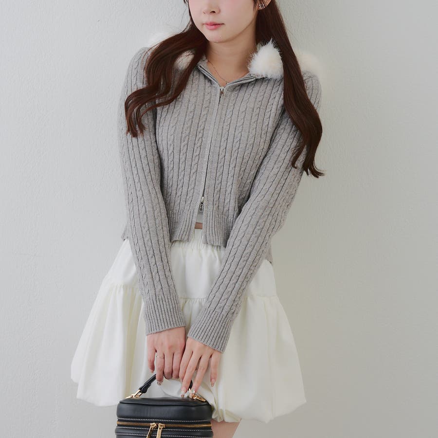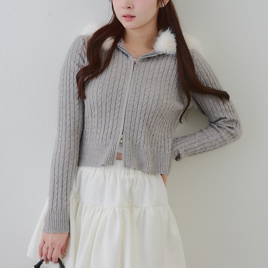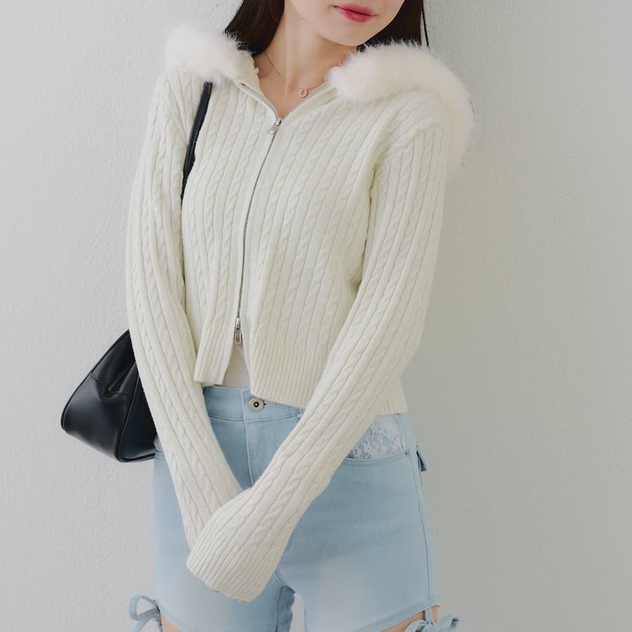 ・フードについたファーが可愛いケーブルニットのパーカー。