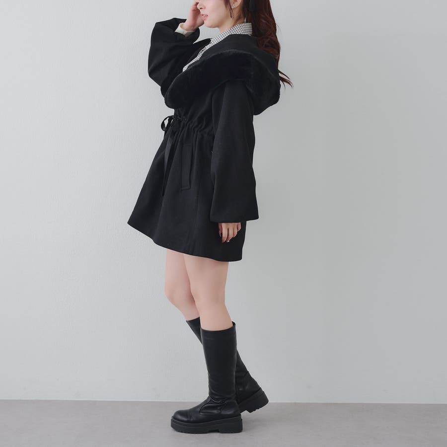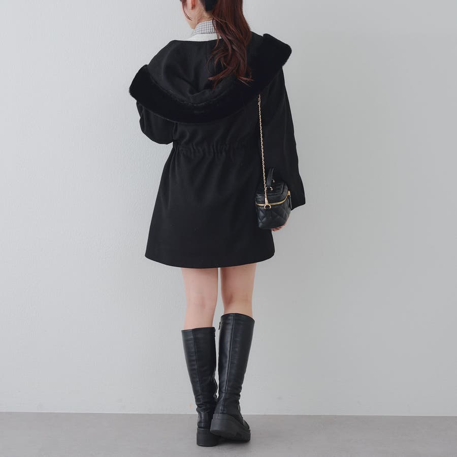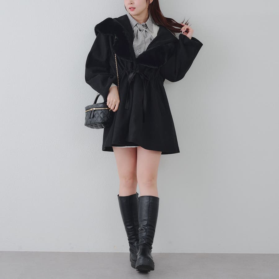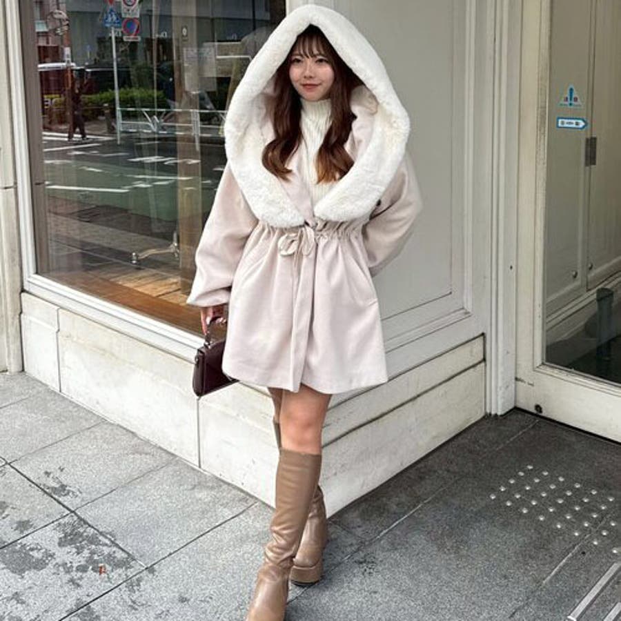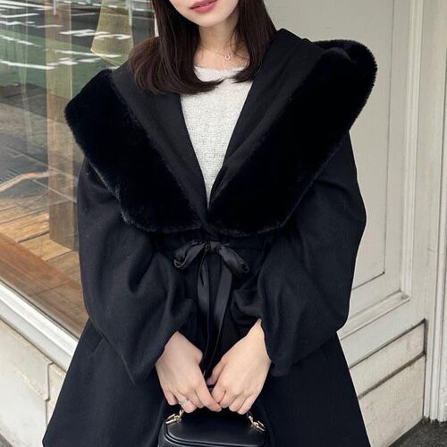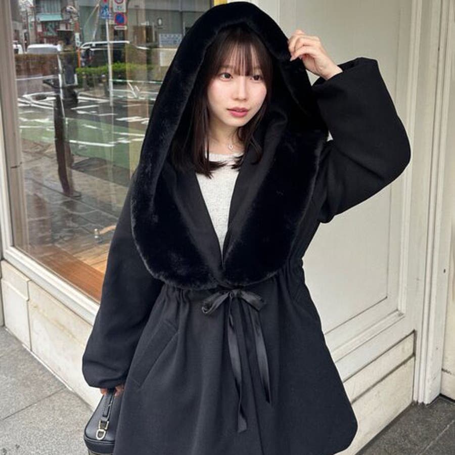 ・大きなフードが印象的なコートは小顔効果抜群でふわふわのファーが女性らしさを演出してくれます。
