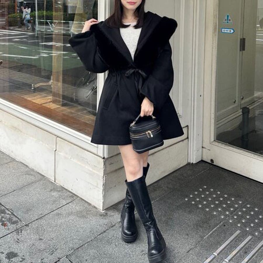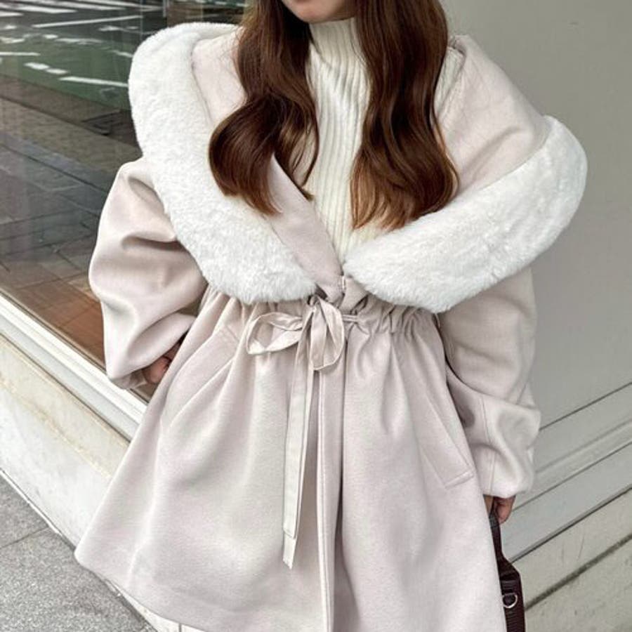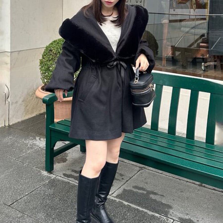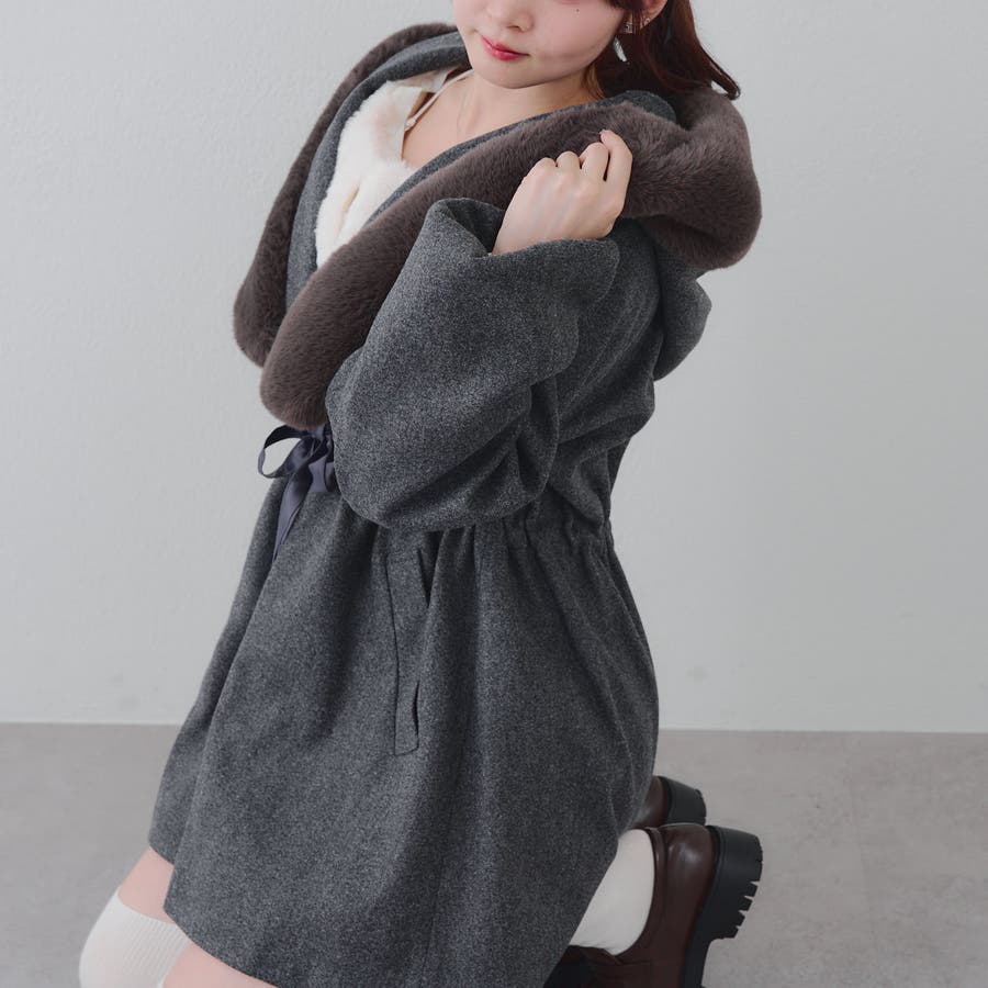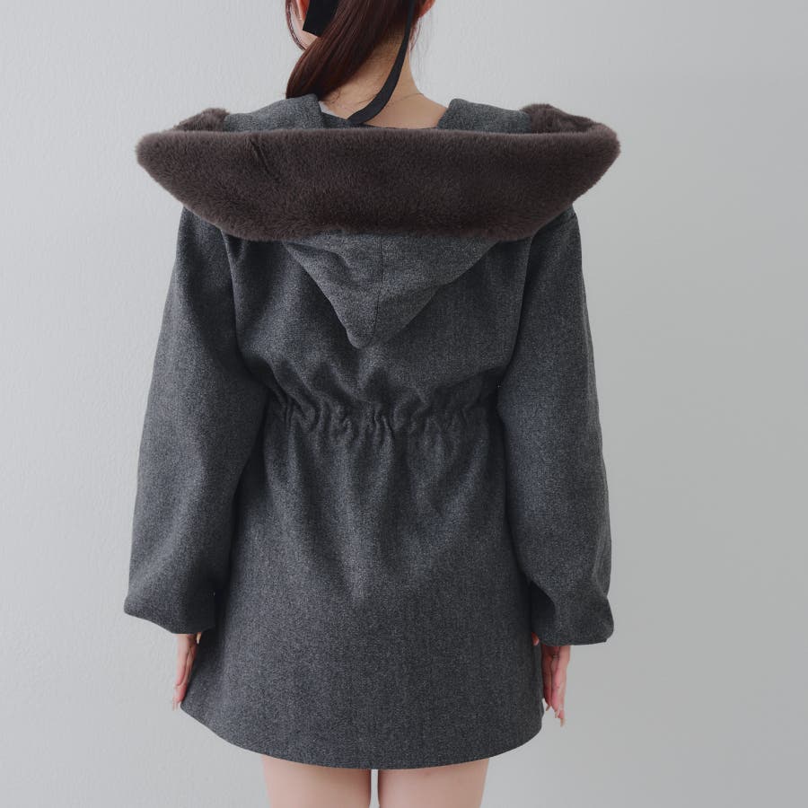 ・大きなフードが印象的なコートは小顔効果抜群でふわふわのファーが女性らしさを演出してくれます。