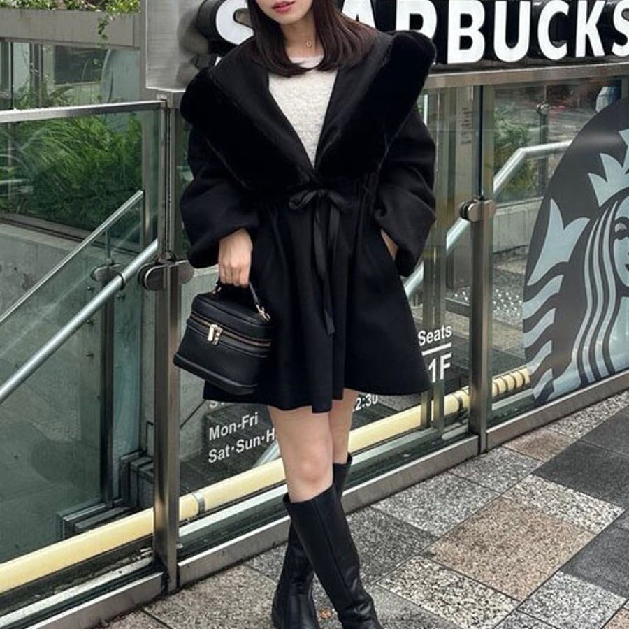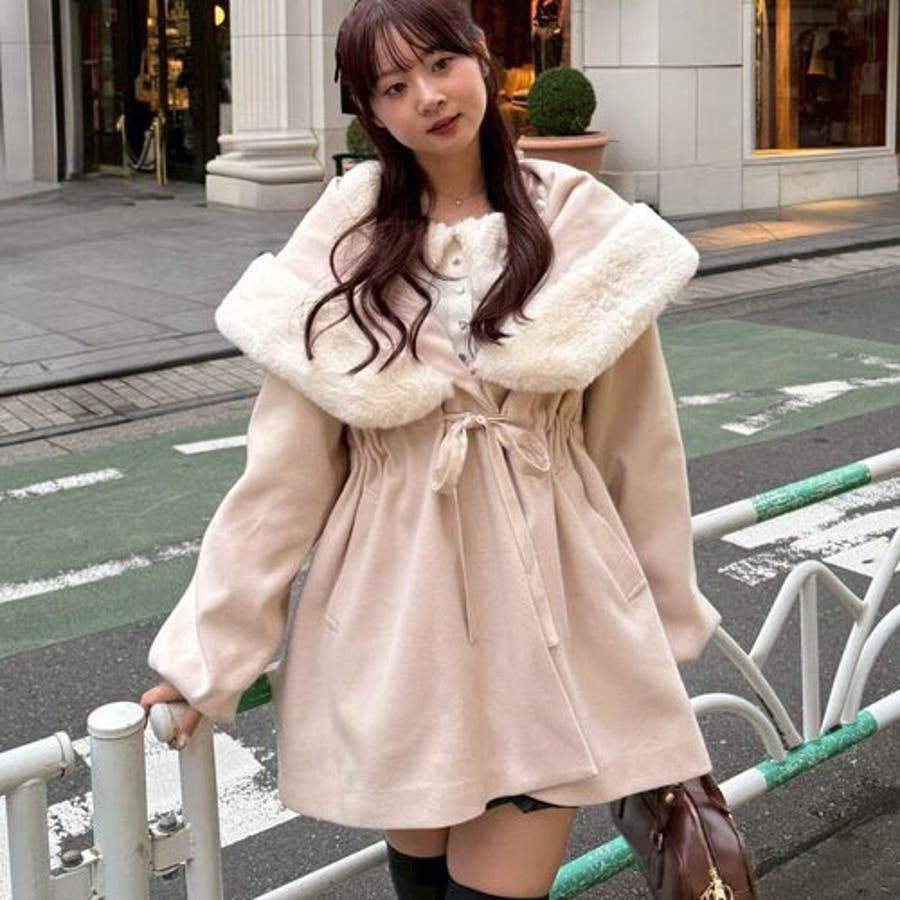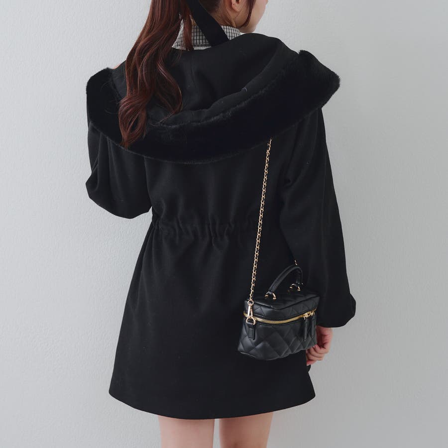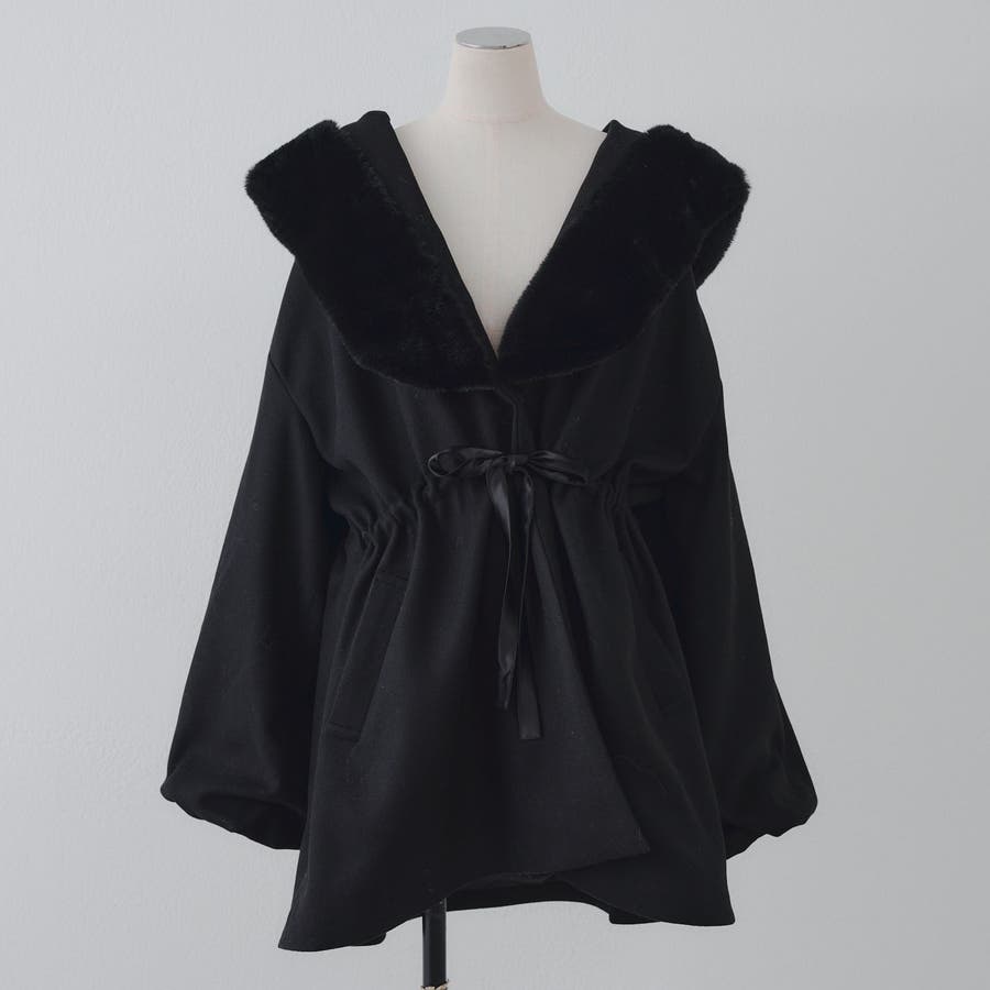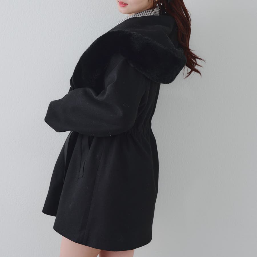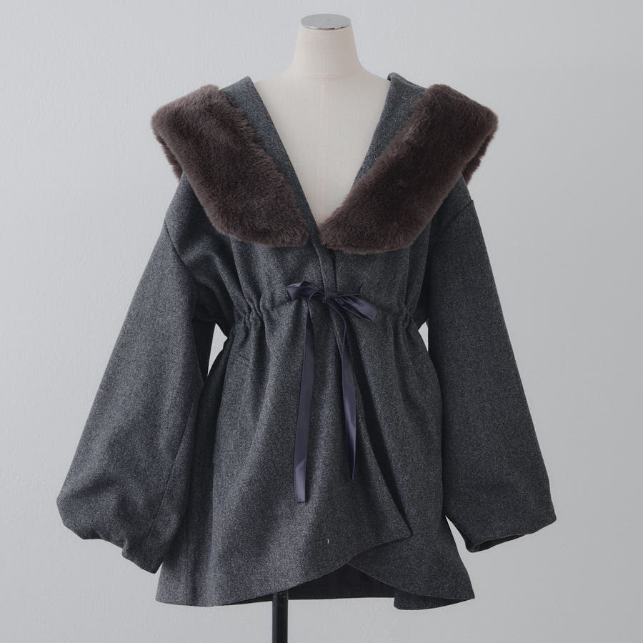 ・大きなフードが印象的なコートは小顔効果抜群でふわふわのファーが女性らしさを演出してくれます。
