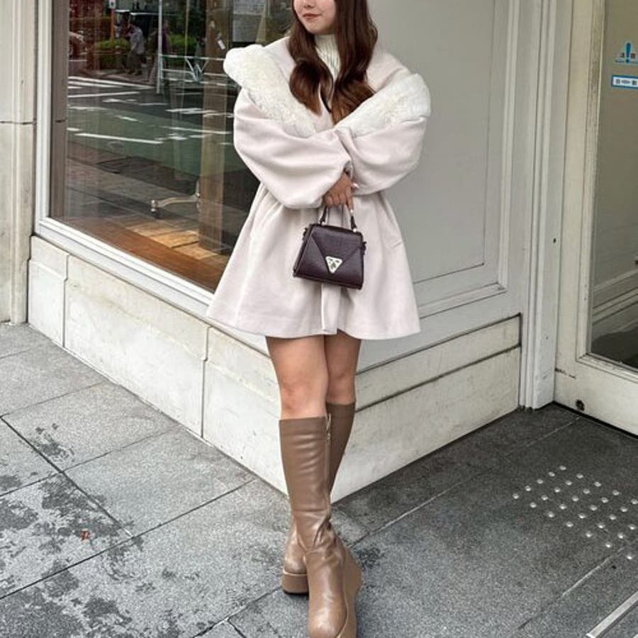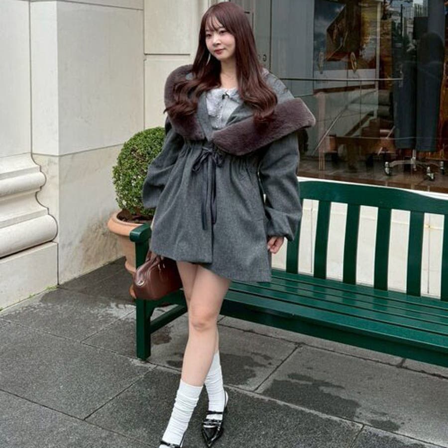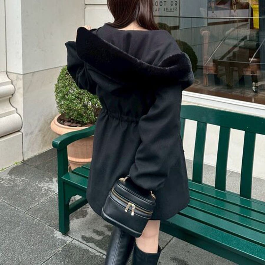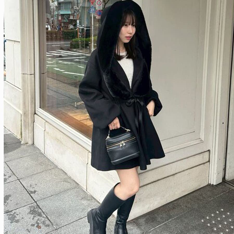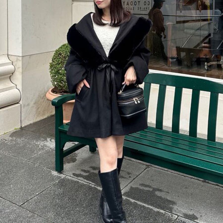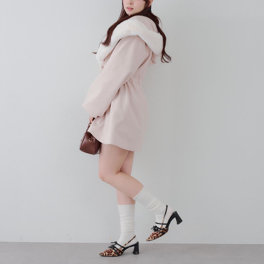 ・大きなフードが印象的なコートは小顔効果抜群でふわふわのファーが女性らしさを演出してくれます。